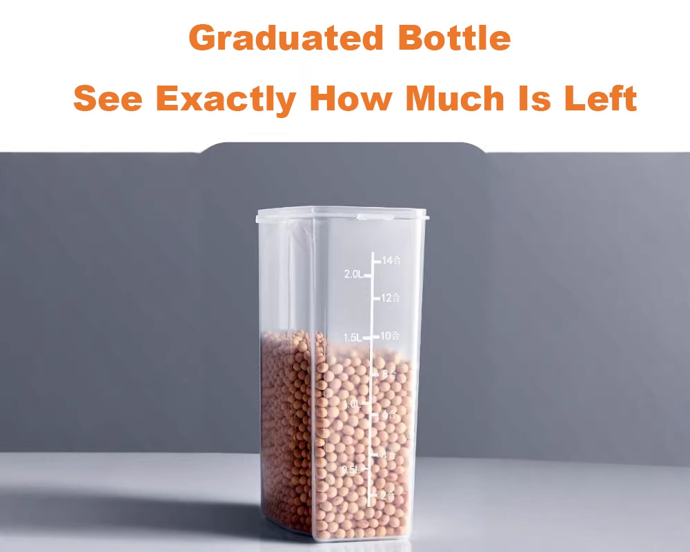 Multi-Purpose Dry Food Storage Ideal for storing rice, flour, cereal, sugar, grains, nuts, beans, snacks, and pet food. Holds 2.5L/5.5 lbs of rice or 3 lbs of pet food, depending on food type.