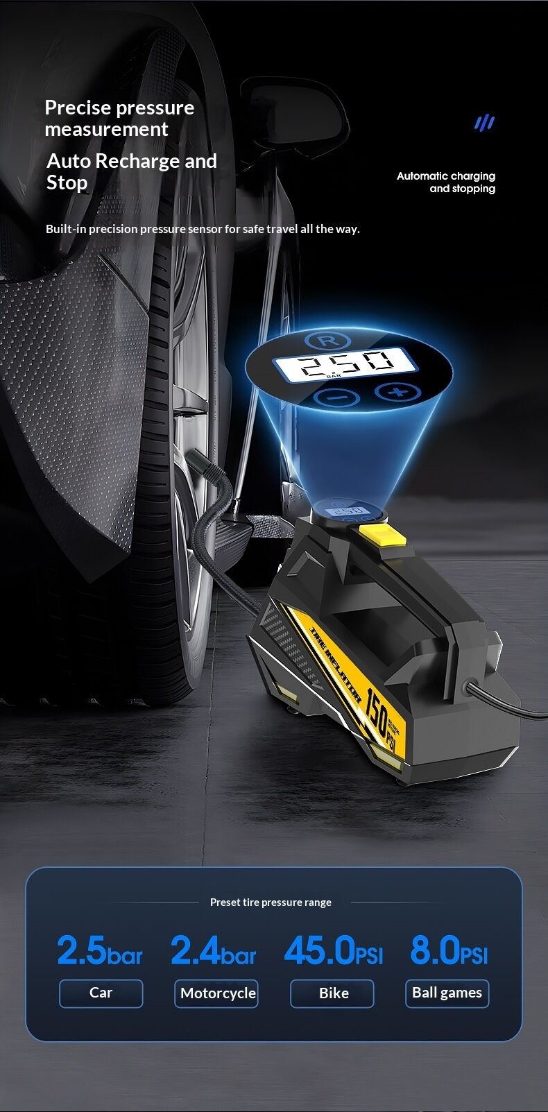 【150PSI MAX WORKING PRESSURE】:With maximum pressure 150 PSI and air flow 35L/min, it can inflate the 195/65/R15 car tire from 0 to 35psi under 5 minutes. It's much faster and more effective than traditional pumps, and comes with an accurate tire pressure gauge.