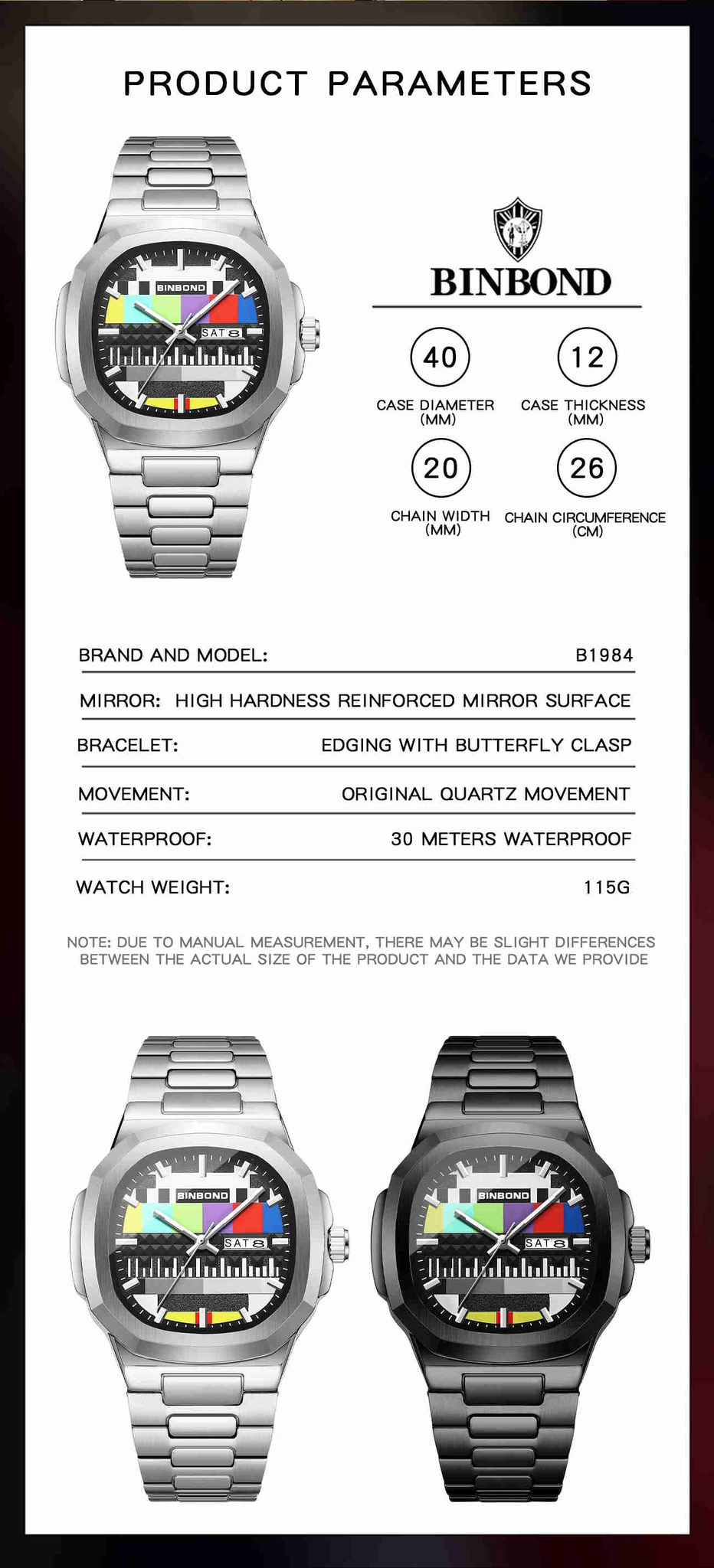 Key FeaturesCase Thickness: 11mmBand Width: 20 to 24 mmBand Material Type: Stainless SteelDial Diameter: 40 to 44 mmFeature: Screw crown,Water-Resistance,Week DisplayClasp Type: BuckleCase Material: AlloyBand Length: 26cmWaterproof: 30 metersStyle: Fashion & Casual