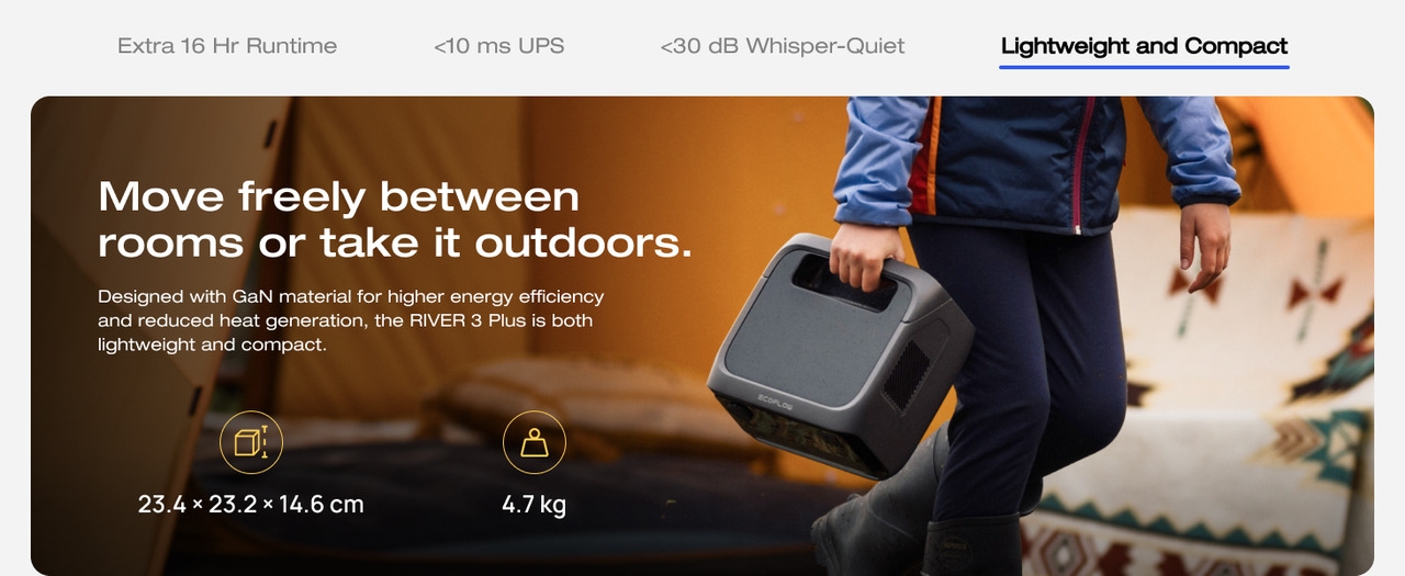 High Power up to 1200W: RIVER 3 Plus powers appliances up to 1200W with X-Boost and provides 600W steady output. It features 7 outlets—3 UPS AC, 2 USB-A, USB-C, and car output—powering 90% of home devices. A built-in light ensures visibility anytime.