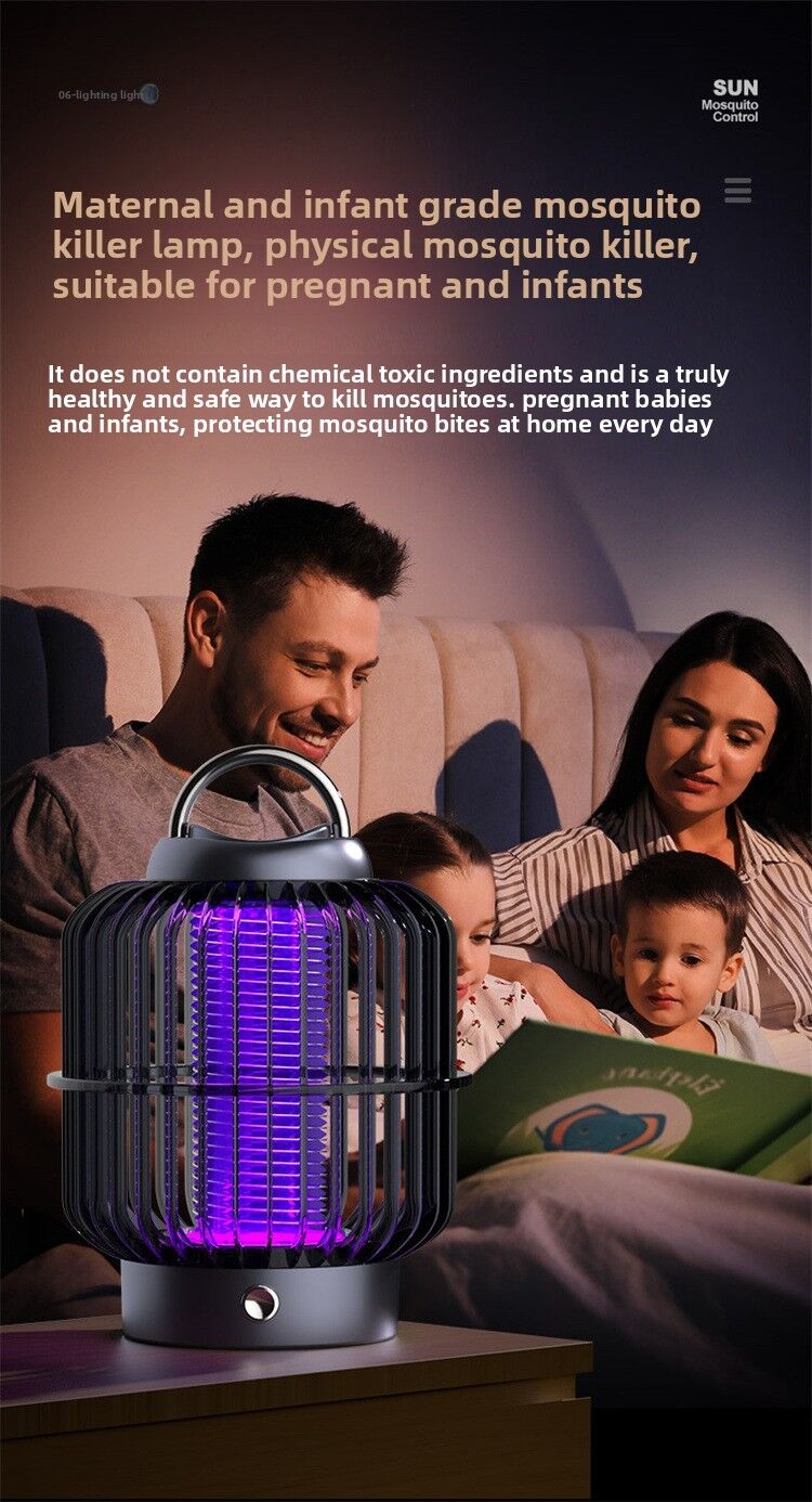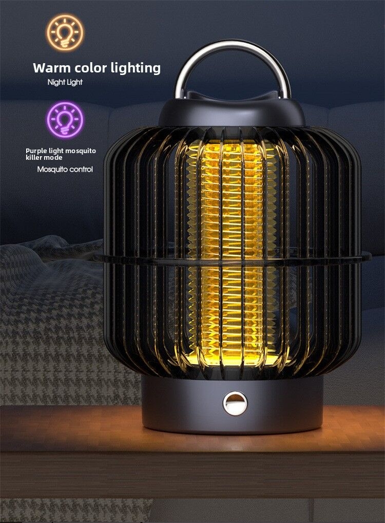 This is a compact electric shock mosquito killing lamp packaged as a “new concept” device. The unit features a brown cage with vertical slats surrounding a blue UV light that attracts insects. When mosquitoes or other pests touch the electric grid inside the cage, they receive a shock that kills them. The lamp has a metal handle on top for easy carrying and a small button on the base for operation. The box highlights features like maximum light, quiet mosquito killing, and safe lighting, positioning it as an efficient, indoor/outdoor pest control solution.