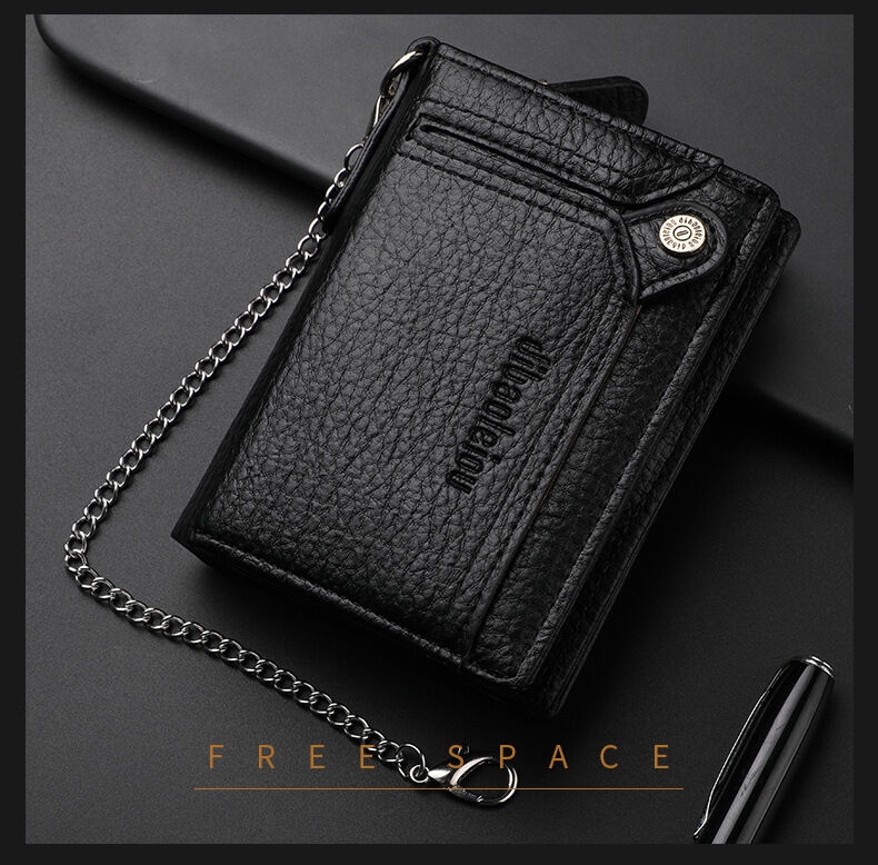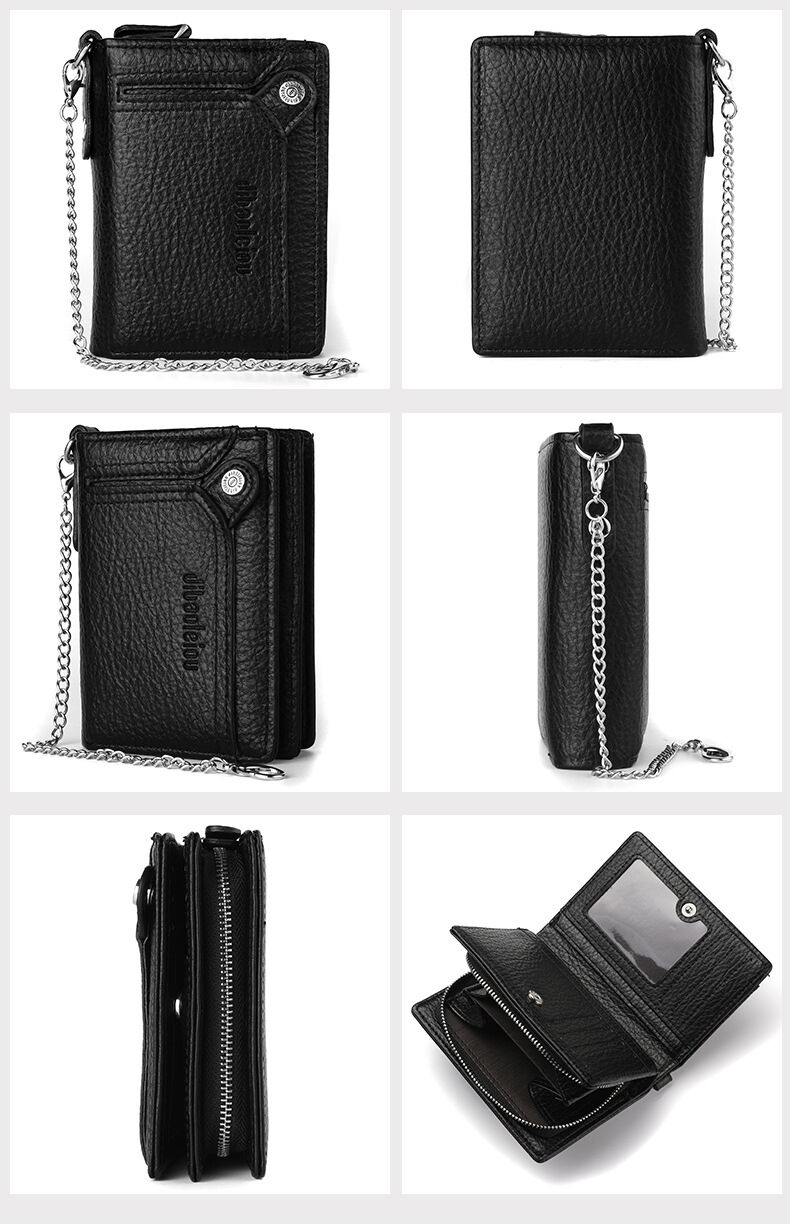 [Security, Privacy, Safety] shielding prevents unauthorized scanning of personal information, protecting you from electronic theft and keeping you safe anytime, anywhere. The leather men's wallet features an anti-theft chain to prevent theft; the chain can be removed via a clasp. Lightweight and slim design.