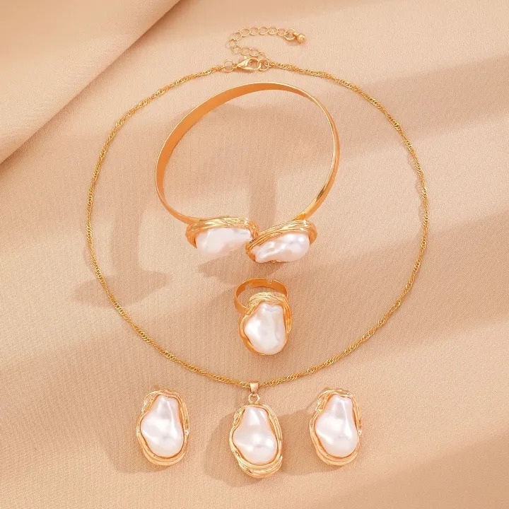 Complete Set Design: The set includes a necklace, earrings, bracelet, and ring, all adorned with matching baroque pearls. This cohesive design creates a sophisticated look, ideal for formal events, parties, or as a statement piece for daily wear.