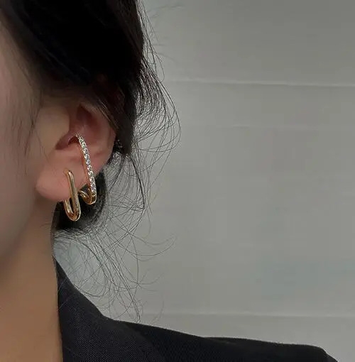 Double-Layered Geometric Design: The ear cuffs showcase a unique double-layered geometric design, combining a plain gold band and a crystal-studded band. This trendy, minimalist look adds a touch of sophistication to any outfit, perfect for both daily wear and special occasions.