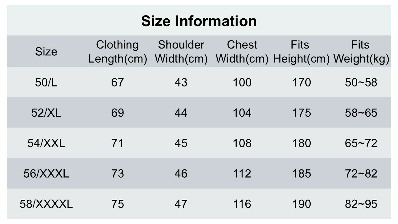 About Size: China size is smaller than the UK/US size. If your US standard size is L, it is recommended to choose XL in our store; if your US standard size is XL, it is recommended to choose 2XL;Such as: United States (M) = China (L); United States (L) = China (XL); United States (XL) = China (2XL); United States (2XL) = China (3XL); United States (3XL) = China (4XL ); United States (4XL) = China (5XL);