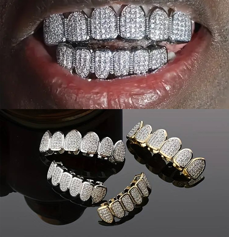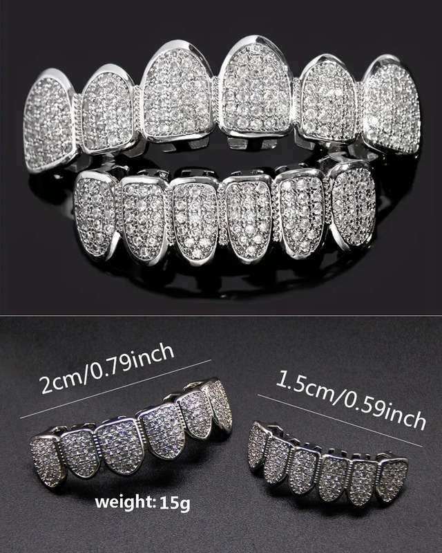 Package: The bling CZ grillz teeth men set come with 4 resizable silicone bars(2 sets) for custom fitting. The top grills for your teeth or bottom false teeth grilld come with 2 resizable silicone molding bar. The Instructions for use are included in every package