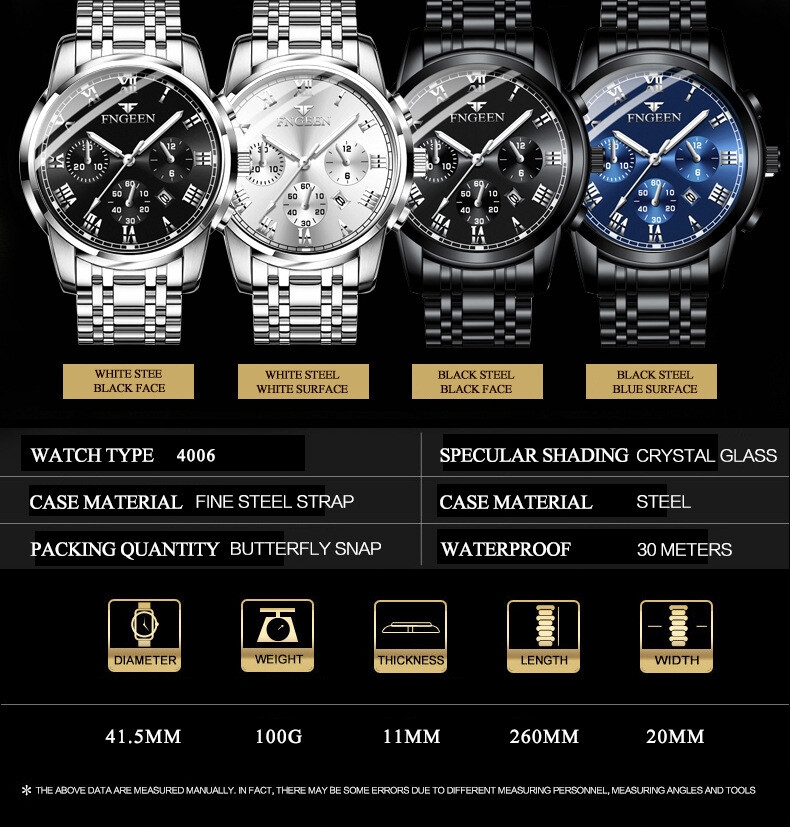 Key FeaturesWatch brand:FNGEENWatch movement:PC-Quartz MovementWatch diameter:35mmWatch thickness:0.8mmBand Width:16mmBand Length:20mmWatch weight:80gCase Material:MetalCase Material:White steelSpecular Shading:Crystal GlassPacking quantity:BuckleWaterproof level:30 meters