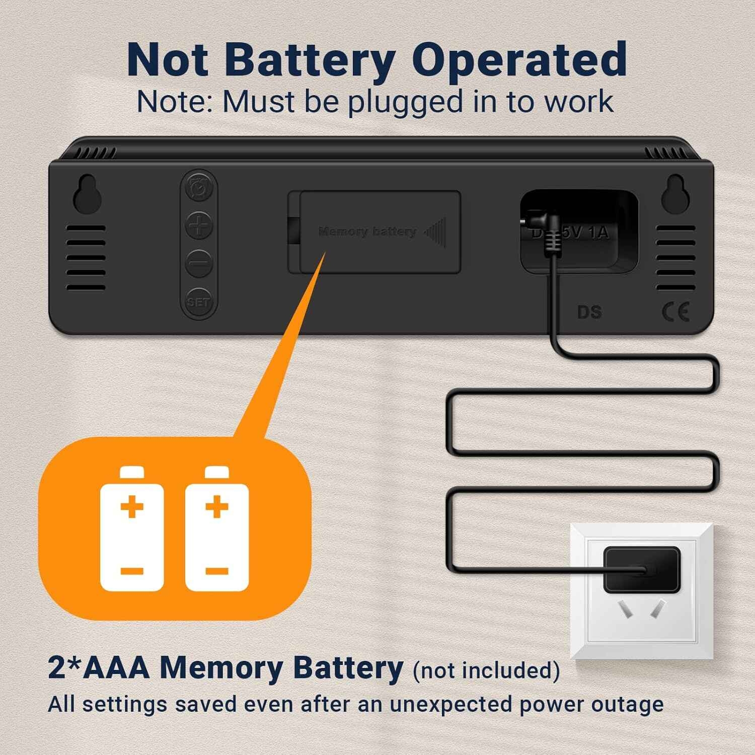 Have to Plug-in: This is a plug-in clock. Not battery operated. Memory batteries (not included) only maintain memory function during power outages