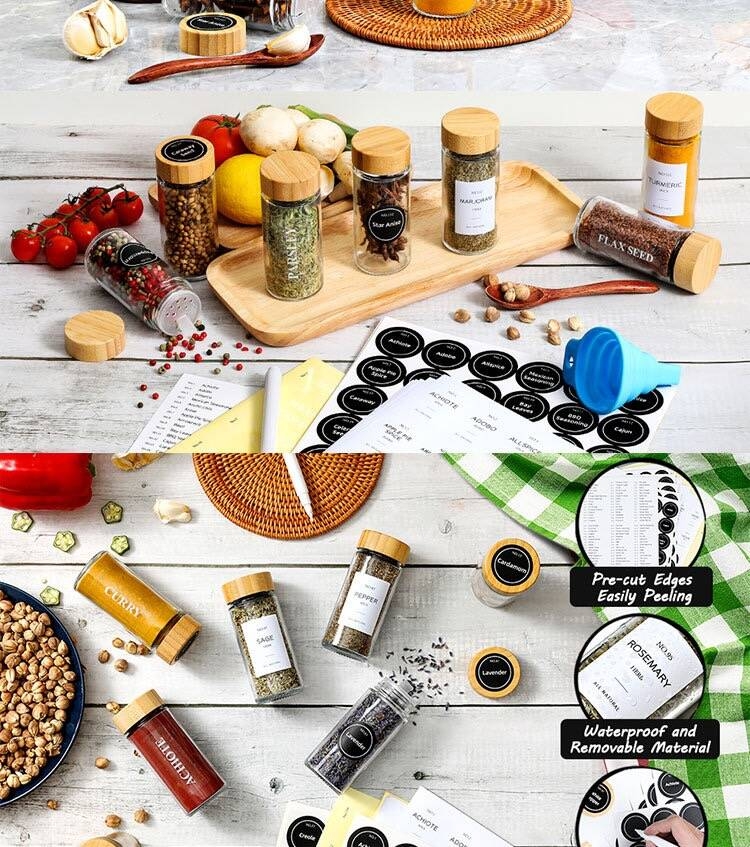 High-Quality Materials: The spice jar lids are made of natural bamboo, ensuring healthier food storage. In addition, the airtight bamboo lids keep spices fresh and dry. The transparent glass body allows you to clearly see the spices inside. The food-grade glass material is safe and non-toxic, BPA-free, lead-free, and not easily broken.