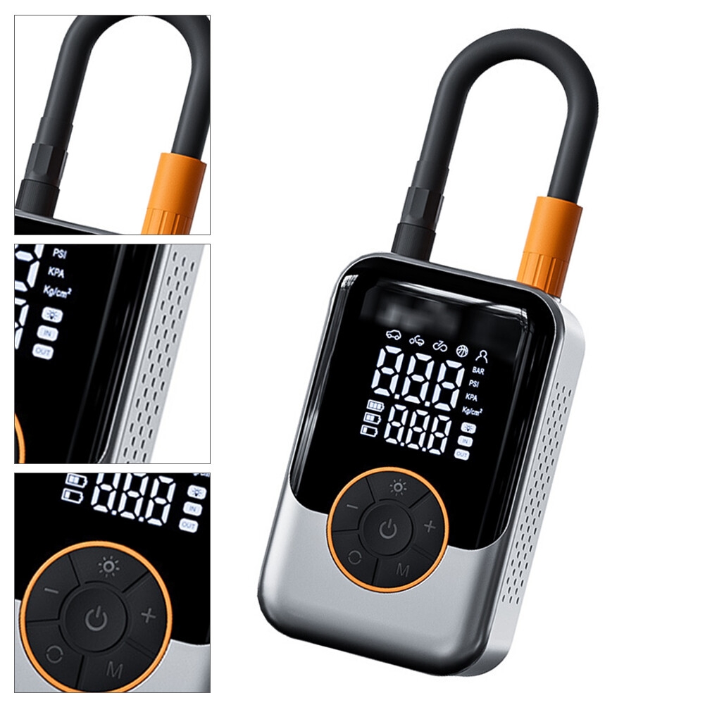 5. [LED Lighting and Compact Design] The tire inflator is equipped with an LED light and an accurate pressure gauge, helping you prepare for nighttime emergencies. Specifications: Color: Black Material: ABS Dimensions: 12*7*5CM Weight: 0.4kg Battery Capacity: 1500mAh*2 Air Pressure: 150PSI Package Includes: Air Pump*1 USB Type-C Power Cable*1 Standard Inflator Nozzle*1 Inflator Adapters*4 Storage Bag*1 Precautions: 1. Do not use to inflate tires on large or overweight vehicles, such as trucks, large trucks, and box containers. 2. When using, start the vehicle engine to increase power and do not drain the vehicle battery. 3. This machine is designed to be powered only by a DC power supply (DC12V). Do not use household high-voltage AC power (AC220V). 4. When inflating, after 10 minutes of continuous operation, stop the machine and allow it to cool for 10 minutes to avoid damage to the pump and accessories. 5. It takes approximately 3-5 minutes to inflate a typical tire to a normal pressure of 30 PSI. Large tires may require slightly longer. If the gauge needle quickly rises to 50-100 PSI during initial inflation, this indicates a blockage in the air path and air is not entering the tire. Immediately disconnect the valve connector before continuing operation. Failure to do so may damage the motor and instrument. 6. Do not leave the machine unattended while in use. Always monitor tire pressure and avoid overloading the machine.