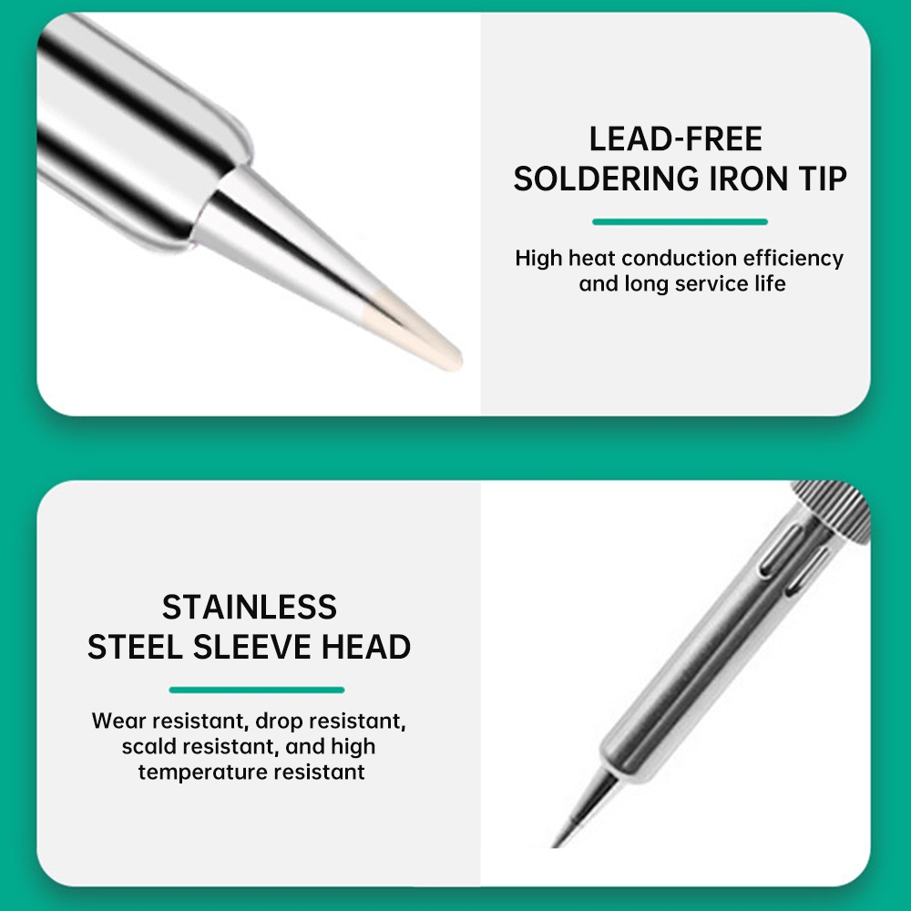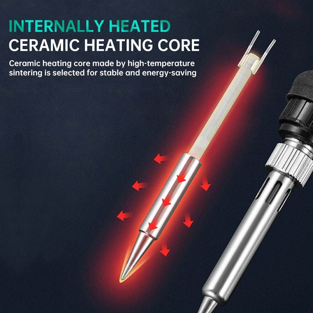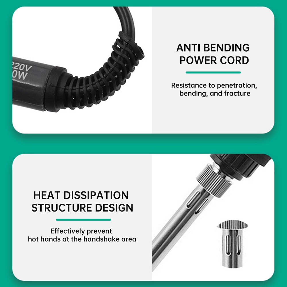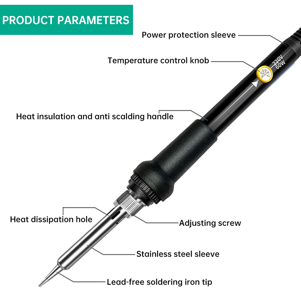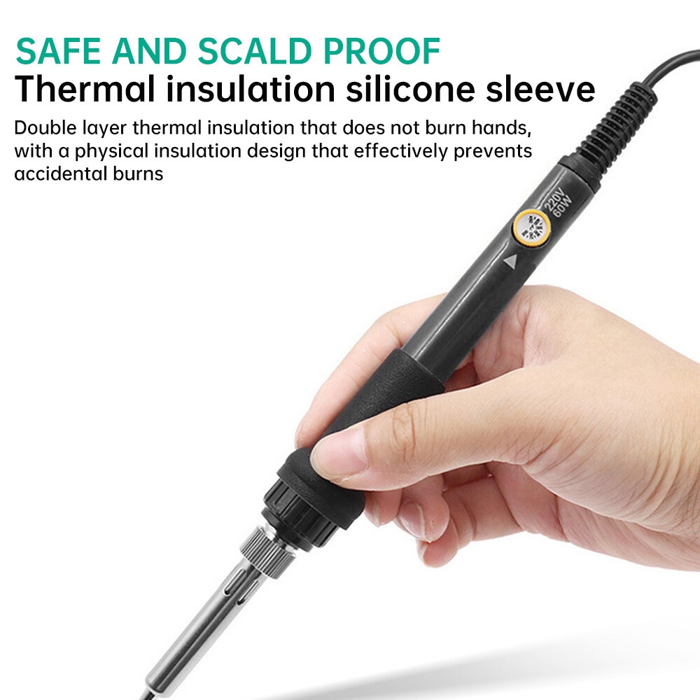 15PCS 60W Professional Electric Soldering Iron Kit /w Adjustable Temperature Welding Tool - EU Plug About this item: 【High quality】: the electric soldering iron has a power of 60 W and an adjustable temperature from 200 to 450 °C to meet different welding conditions. The soldering iron kit comes with a switch for easy operation. You can easily save energy and ensure safe soldering. 【Fast heating and cooling】: the electric soldering iron uses internal heat ceramic technology to ensure that the soldering iron heats up quickly, has good thermal conductivity and saves energy. The four ventilation holes on the gun ensure better heat dissipation and extend its service life. 【Metal soldering iron stand and cleaning sponge】: the metal soldering iron stand keeps the soldering iron stable and easy to use, and the soldering sponge can easily remove stains on the tip and extend its service life, which is suitable for long-term welding and repair work. 【A complete soldering kit】: You will receive a soldering iron, 5 soldering iron tips, spring stand + sponge, black screwdriver, curved tip tweezers, desoldering pump, wire stripper, red and black electronic cable and tool storage bag for convenient storage of equipment and easy carrying. 【Versatile】: 5 different tips can meet all your soldering needs. Best gift idea for DIY, repairing various electronics, soldering, jewelry, guitars, watches, wiring, mobile devices, computer hardware, small electronic work. Product details: Power Mode: EU Power Supply Operating Voltage: 220V Irons: 200-450 ° C Instructions for use: 1. After turning on the soldering iron, it can be adjusted to the temperature you need, the drill bit will start to heat up, and when the solder wire starts to melt at the contact, it is ready to use. 2. Start soldering by making sure the molten solder makes a clean connection between the contacts you are trying to solder. 3. Once enough solder has been placed, remove the solder wire and iron and wipe off any remaining solder with a damp sponge. 4. Always remember to power off the iron and place it in the holder provided, while cool enough to store safely.