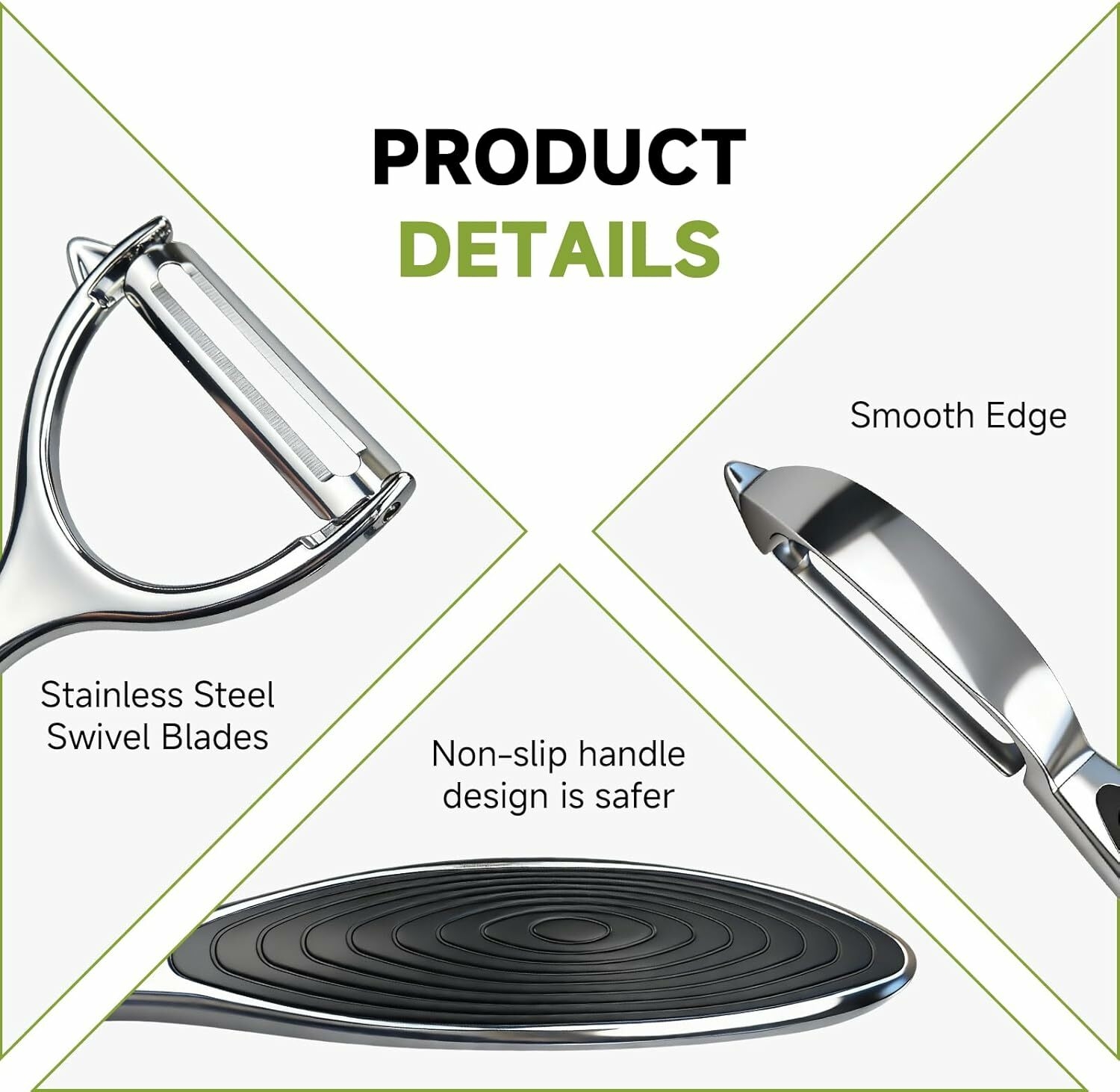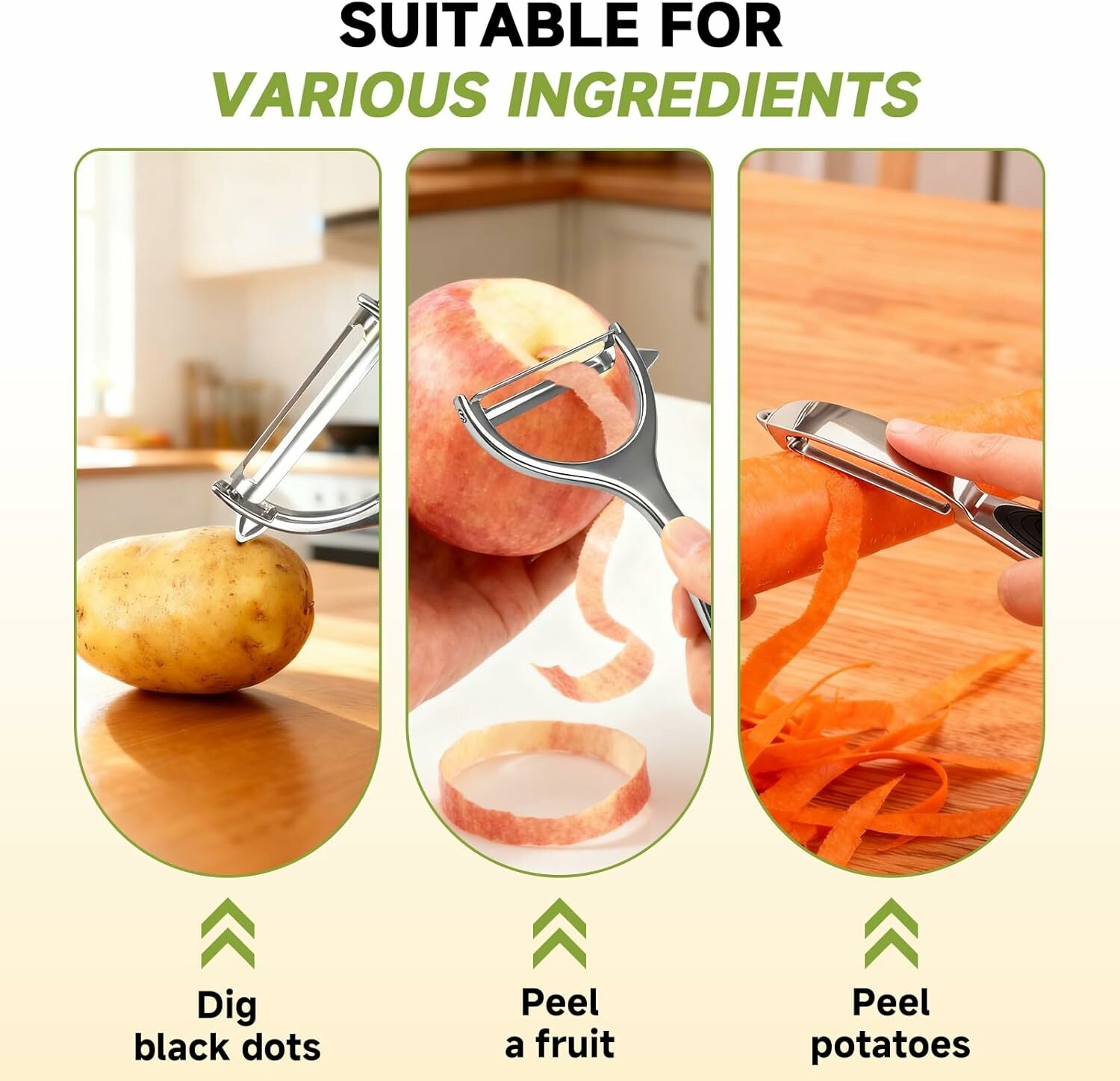 ????【Ultra-Sharp, Clean Peels】Swivel blades glide through potato, carrot, apple and cucumber skins with minimal resistance—no clogging, just clean ribbons. Built-in potato-eye remover tidies blemishes fast.