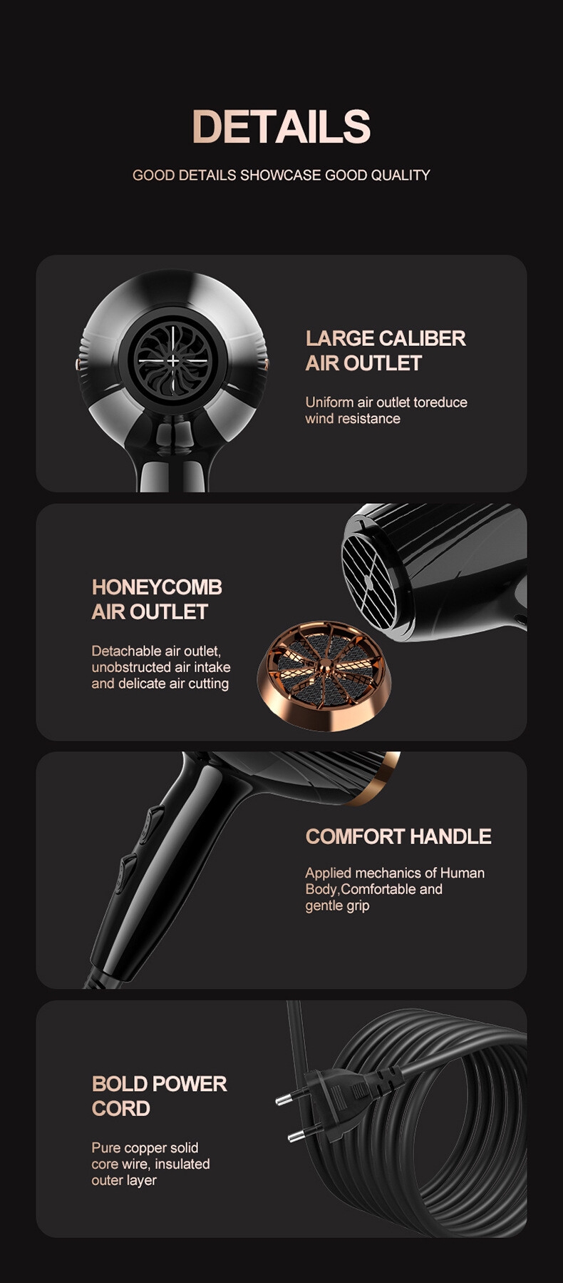 1x hair dryer ,1xPointed tail comb, 1x flat comb, 1x comb-shaped air nozzle, 1x collecting air nozzle, 1x shaped air nozzle, 1x Instruction for Use