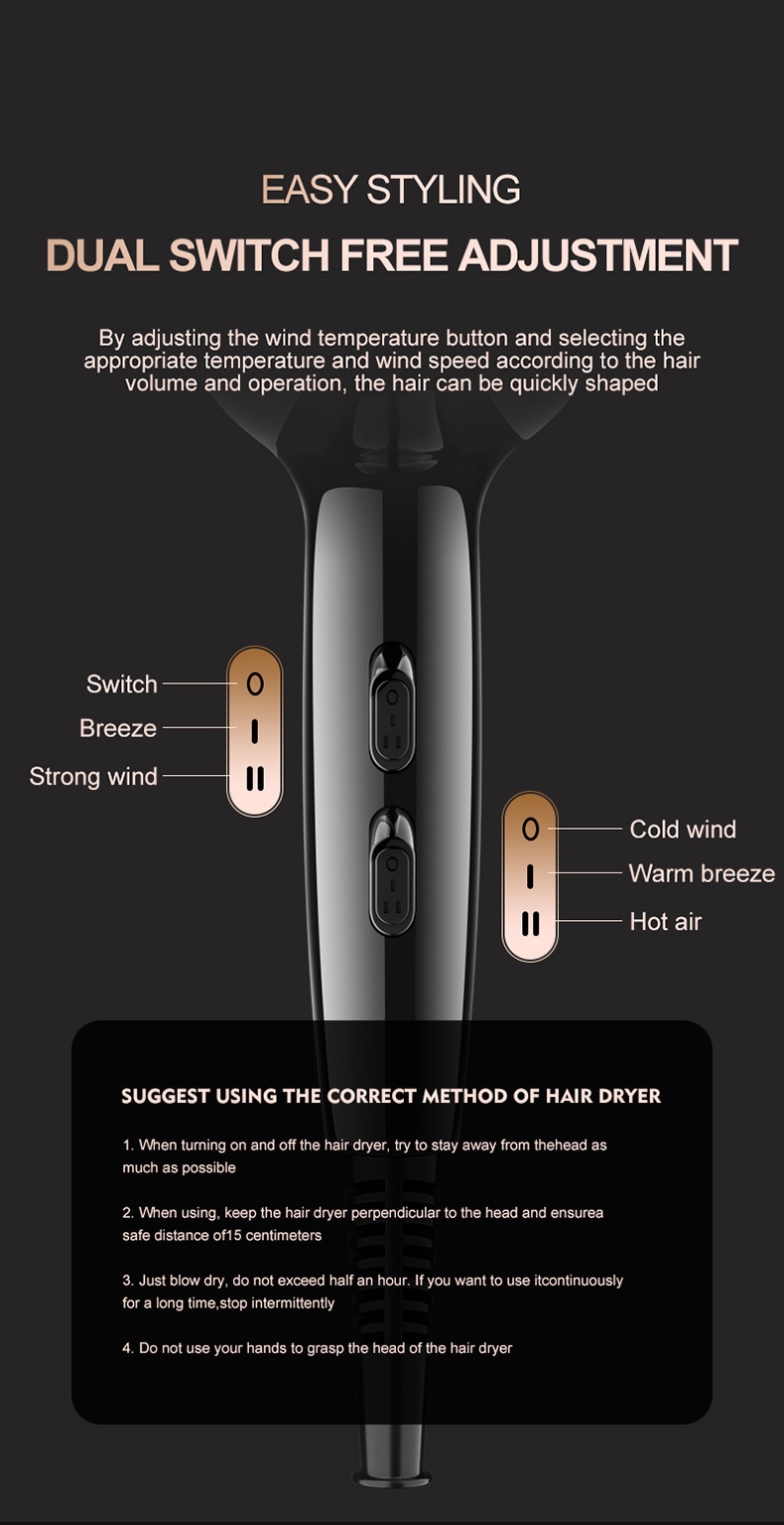 Product Features: This 2000W professional hair dryer delivers powerful airflow and an intelligent constant temperature system for fast drying without damaging your hair. Switch freely between cool and hot air to suit all styling needs. With 5 included accessories—tail comb, flat comb, styling nozzle, concentrator, and diffuser—it effortlessly creates sleek straight hair, voluminous curls, or precise styles, offering a salon-quality experience at home. Product Attributes: Additional function: Alternating hot and cold air