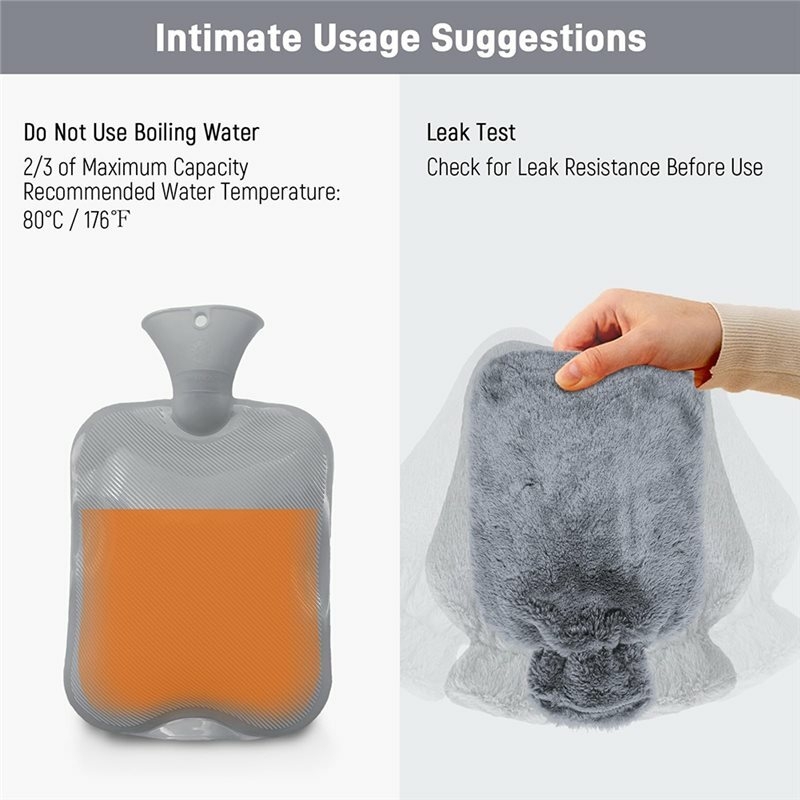 2L Hot Water Bottle With Cover - Cuddly Soft Fur Cover , Hand Warmer for Children and Adults, Pain Relief (Grey) ## I. Core Features and Performance 1. Multi-function hot water bottle: Advanced thermoplastics keep heat longer than traditional hot water bottles, with a cover for pain relief, and can also be used as an ice pack or cold water bag for cold compresses. But please note: hot water bottles are not suitable for microwave heating. Adults should always supervise and never fill with boiling water. 2. Soft and fluffy cloth cover for extra comfort: The 1-liter hot water bottle comes with a luxurious fur cover. On a cold night, sitting on the sofa with a cup of tea is a perfect choice for a cozy night. Especially in winter, a hot water bottle with a cover will make you feel comfortable. 3. Easy to use: The wide mouth design makes it easy to fill water and use. The soft cover evenly distributes heat to prevent you from overheating. It is an ideal bed warmer. The outer cover is washable. Fill only two-thirds of the capacity at most. 4. Right-hand man: First, the warm water bottle can be used as a heating pad for women's menstrual cramps, or treat muscle soreness, stress or cramps, arthritis, pain, stiff neck, lower back pain and other common pains through hot compresses. Secondly, it is a good hand and foot warmer in daily life. In addition, it can also double as a cold pack for those with fever or reduce swelling for minor injuries. 5. Durable, safe and environmentally friendly: This hot water bottle is leak-proof and durable. The fluffy hot water bottle and lid are environmentally friendly and safe for babies and children. ## II. Specifications: Color: Grey Product Category: Water-filled Hot Water Bag Material: High-density PVC