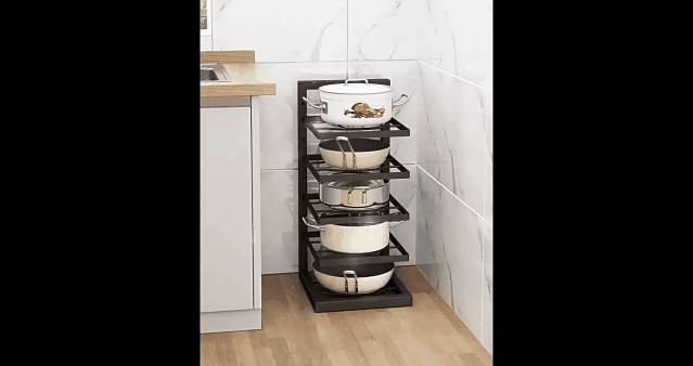 4-Tier Adjustable Kitchen Heavy Duty Pot and Pan Rack & Organizer, Portable Pot Storage Rack/Stands, Cooking Pot Holder Rack Description: This pot rack is designed to fit snugly in kitchen corners, effectively utilizing space that might otherwise go unused. This space-saving design helps you maximize your kitchen's storage potential. Its secure structure holds the weight of pots and pans without the risk of them shaking or falling. You can trust it to keep your cookware safe and organized. One of the standout features of this rack is its adjustable tier height. You can customize the spacing between tiers to accommodate a variety of pot and pan sizes, ensuring your cookware fits perfectly and is easily accessible. This provides storage versatility, meaning you can neatly arrange cookware, regardless of its basic shape, optimizing kitchen space. Features: 1. [Adjustable Height] Our adjustable pot organizer has four adjustable zones, allowing you to adjust the tier height to suit your needs and accommodate different cookware, making it more convenient for you to organize your kitchenware.
