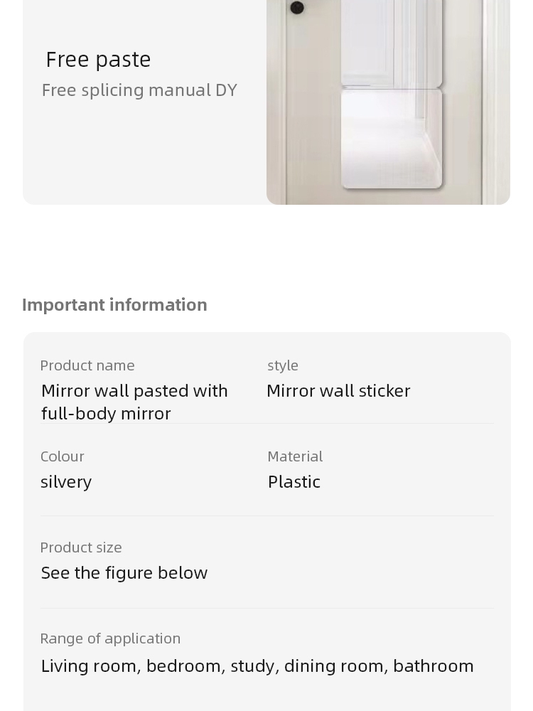 Easy-to-install self-adhesive mirror - This full-length wall mirror comes with strong double-sided adhesive, which is more stable than OrdinaryGlue, waterproof, durable, and environmentally friendly. It won't easily damage the wall surface and is simple and convenient to install.