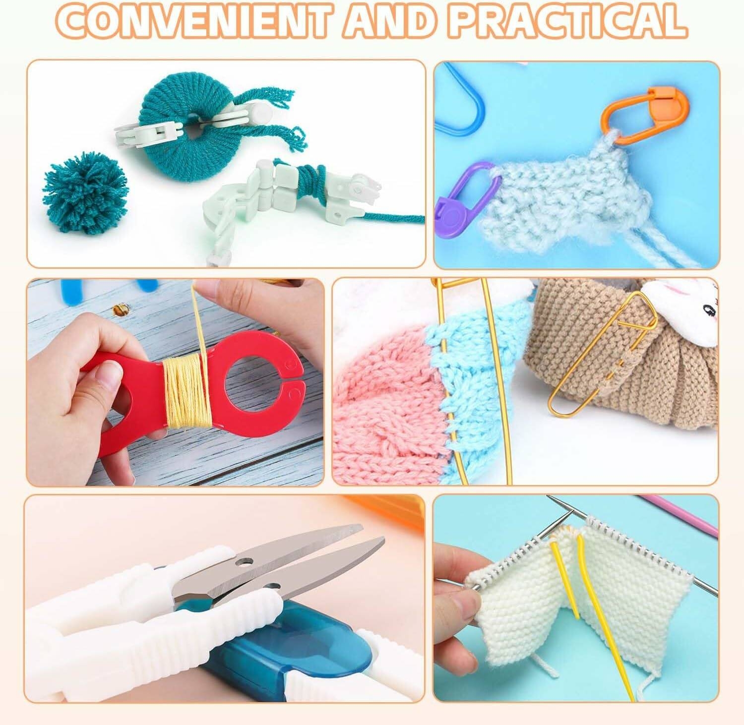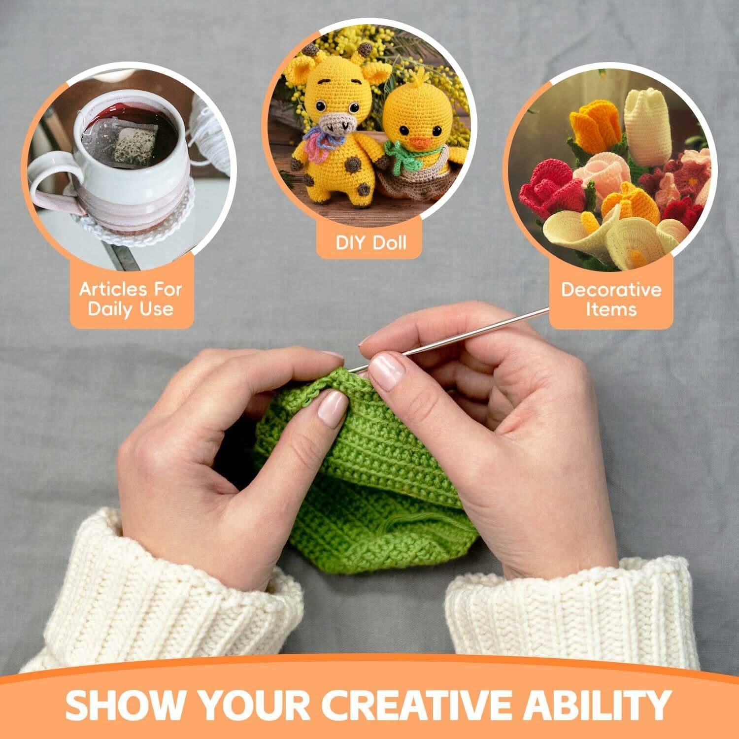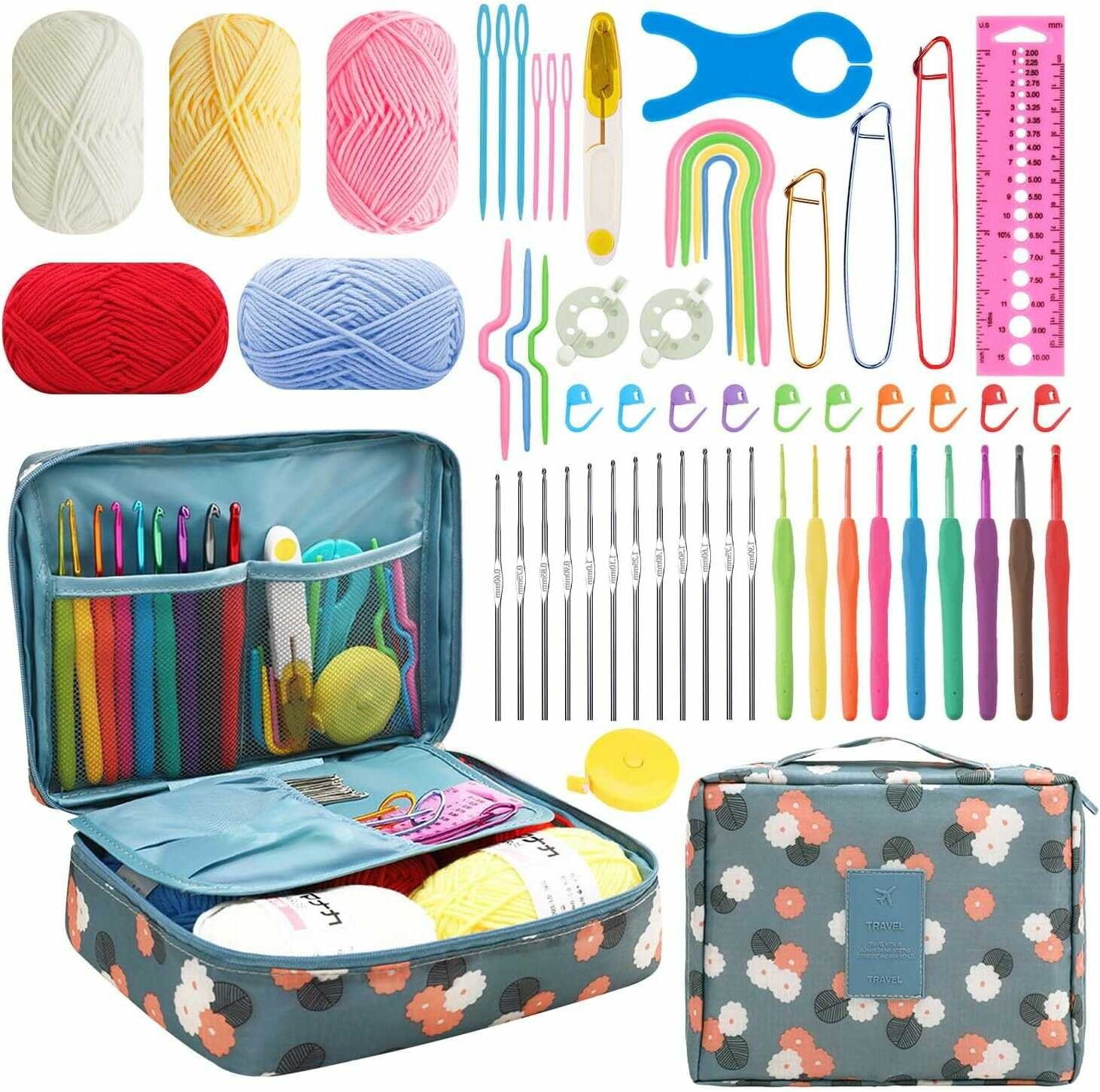 Crochet Kit for Beginners Adults】The crochet starter kit include 9 crochet hooks with soft grip, 12 silver crochet hooks, 5 yarn, 10 stitch markers, 6 plastic sewing needles, 3 cable needles, 4 U shape needles, 1 bobbin, 1 tape measure, 2 stitch holders, 1 scissors, 2 pom makers, 1 needle gauge, 1 crochet hook case. Complete DIY craft crochet accessories and supplies will meet your all crocheting needs.