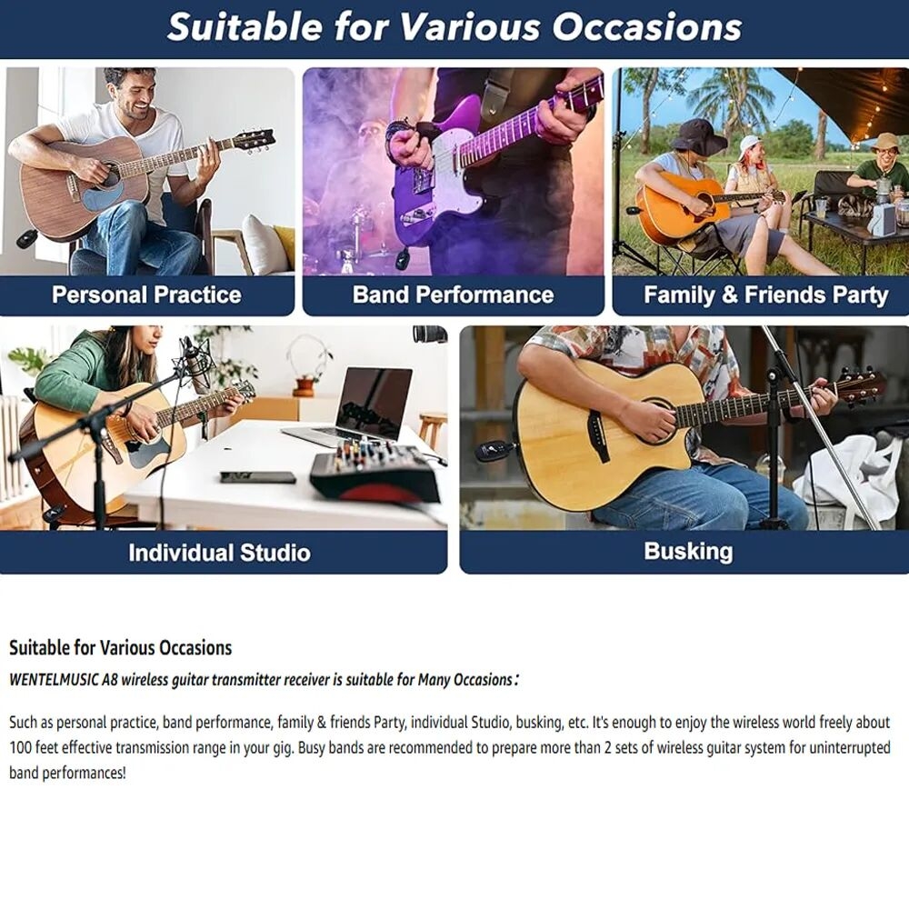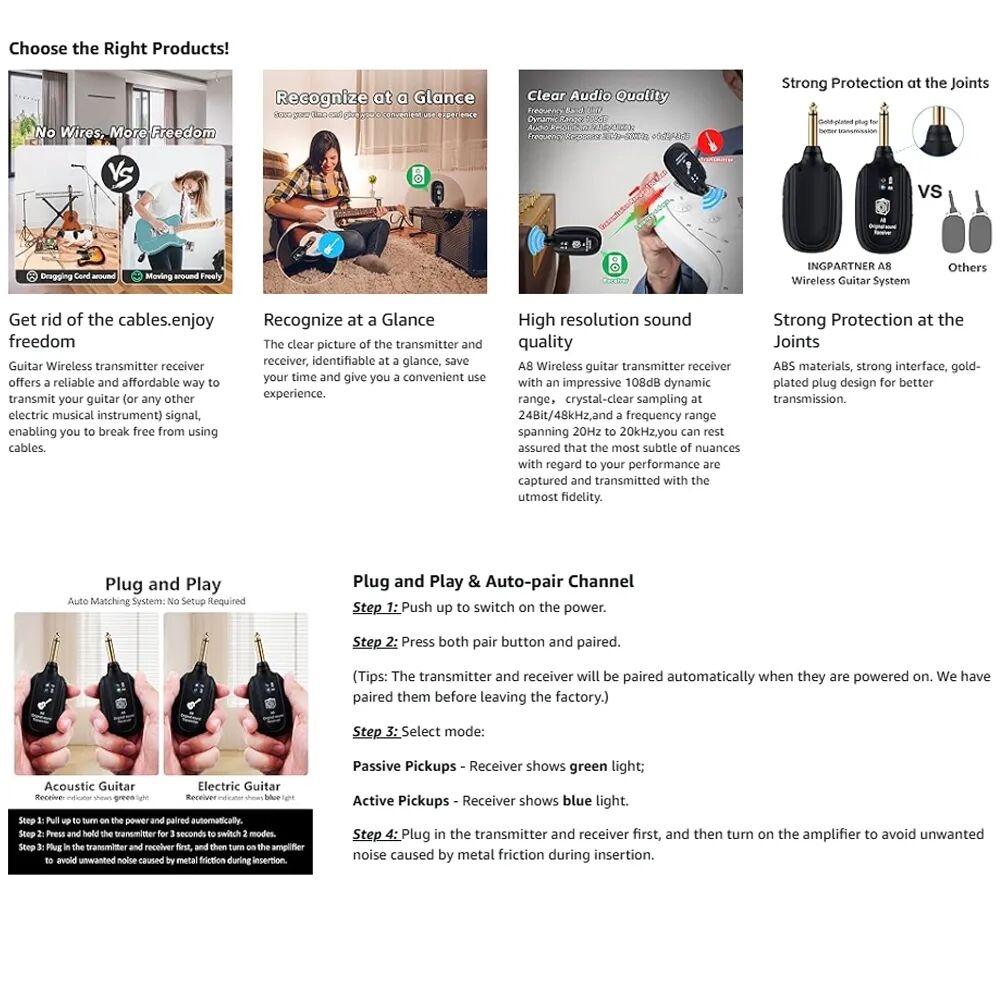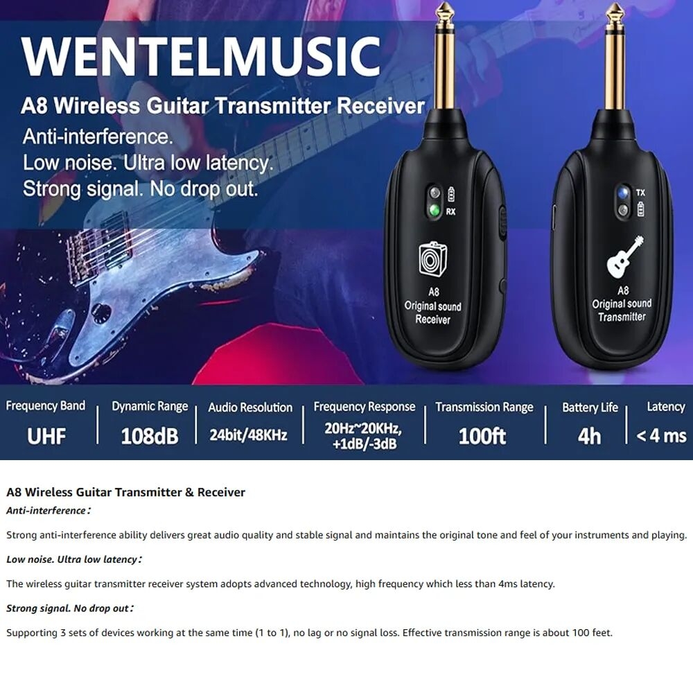 1. Premium 2.4GHz Wireless System for Electric Guitar and Bass The 8 wireless guitar transmitter and receiver system operates on the 2.4GHz frequency band, offering strong anti-interference capabilities.