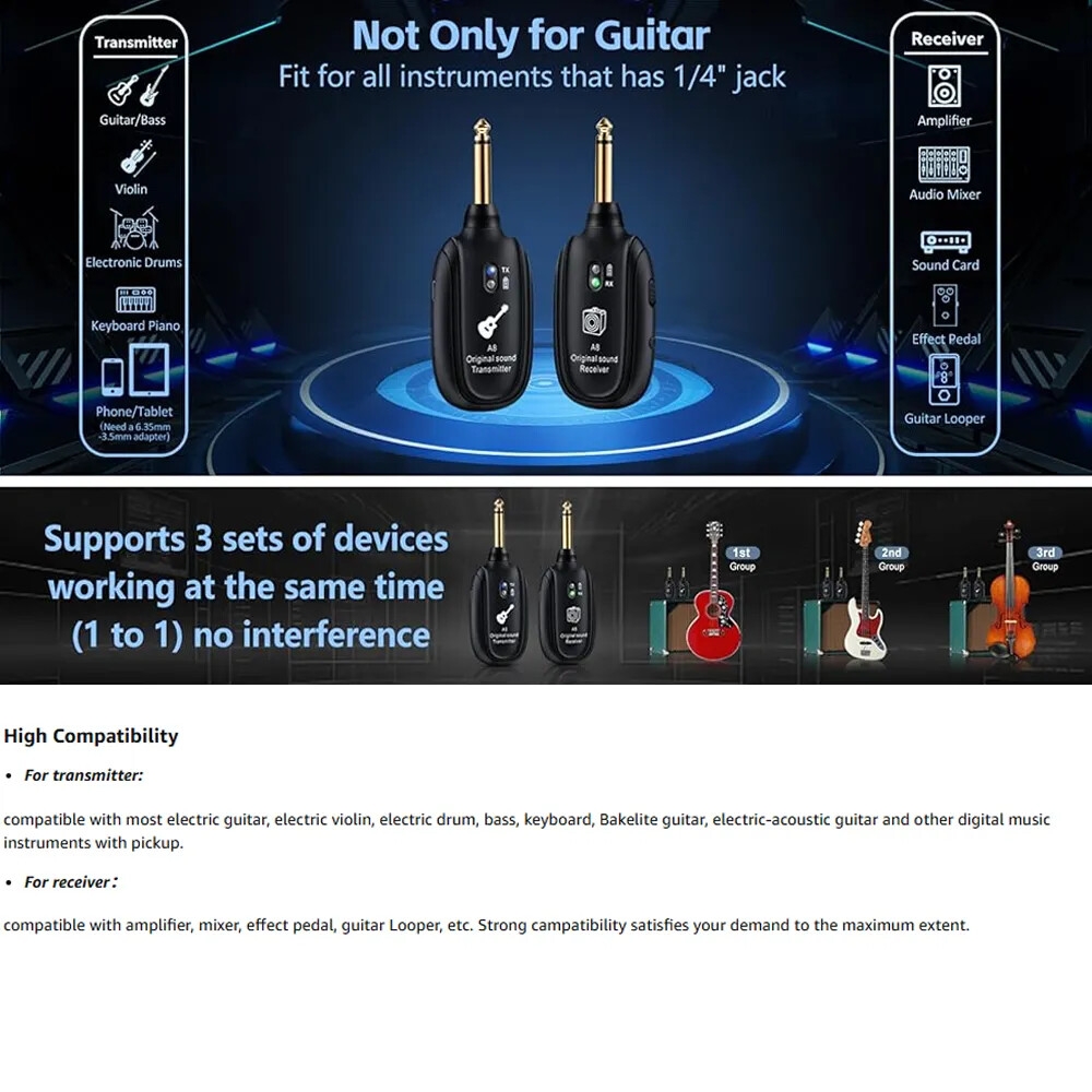 5. Versatile Compatibility for Electric Guitars, Bass, and More This wireless audio transmitter and receiver system is compatible with electric guitars, bass guitars, and other instruments with pickups.