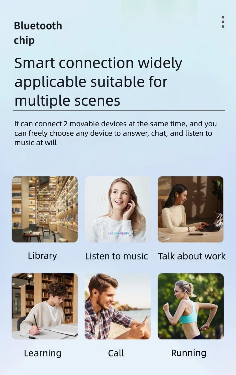 3. Bluetooth 5.3 Chip: Featuring the latest Bluetooth 5.3 technology, the earphones offer faster transmission speeds and more stable connections, with an effective range of 12-15 meters, reducing lag and ensuring smooth audio playback.