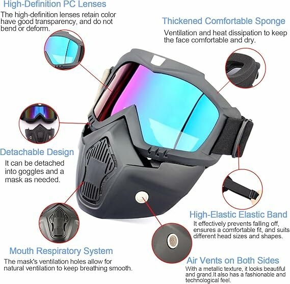 【Comfortable to wear】Motorcycle mask glasses are equipped with adjustable straps, which are easy to adjust to your desired size. The non-slip belt is suitable for various head shapes, and the breathable and thick edging foam provides a unique sense of comfort. The filter mouthpiece makes the ventilation system inside the mask circulate naturally and the air is fresher.