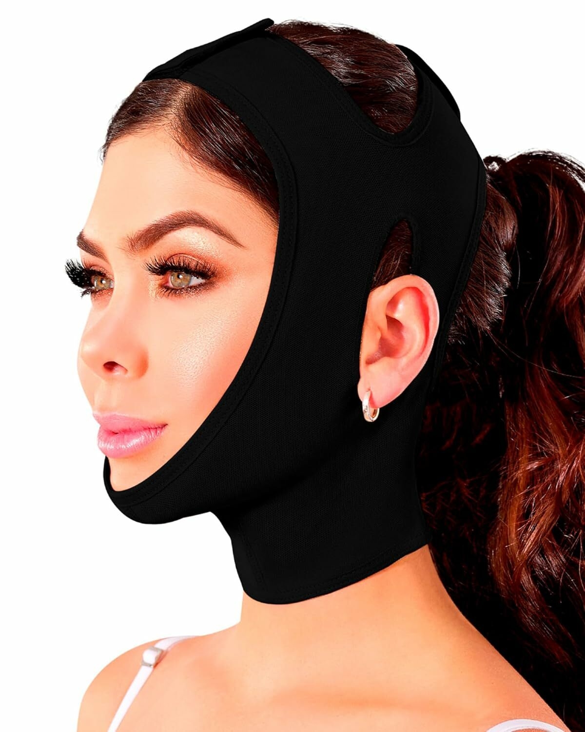 COMFORTABLE CHIN STRAP HIGH COMPRESSION: (Composition: 85% Polyamide, 15% Spandex; Lining: 82% Polyamide, 18% Spandex) This compression garment helps to accelerates the recovery process, and allows users to return to their daily routines faster than expected.