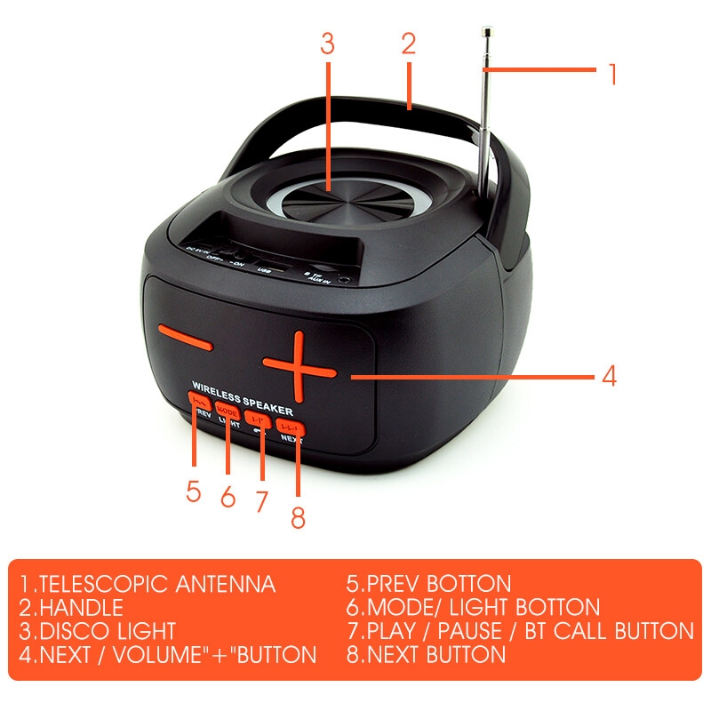 *with USB/TF MP3 playback, with 5.0 B-T function *With Disco light
