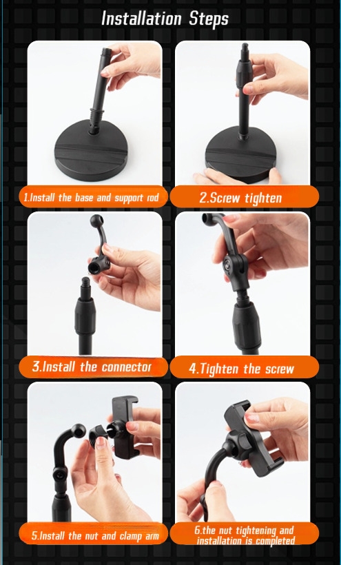 ADJUSTABLE HEIGHT AND ANGLE: This ergonomically designed cell phone stand comes with a 360-degree rotating ball head and 180° front and back tilt adjustment angle, which provides a multi-directional view and helps to reduce neck and back fatigue, allowing you to have a more comfortable angle when watching, reading, studying, playing, video calling, or conferencing, and you can adjust the height. Easily adjust to your favorite height with the smooth sliding lever. HIGH QUALITY, ANTI-SCRATCH AND NON-SLIP: This desktop cell phone holder comes with a large silicone pad, wide and stable base to move the holder won't slip or or scratch, the grippy clip on desktop holder won't let your phone fall off. EASY TO ASSEMBLE AND USE:Easy to install, no tools required. Simply twist each connection to assemble and disassemble; Easy to use, just use it on a flat surface without worrying about the device tipping over, the desktop cell phone holder is an ideal gift choice. WIDE APPLICATION: This cell phone stand is great for watching videos, reading, studying, playing games, also for video calling, video recording, live streaming, online meetings, it is a great desktop accessory for office and home.