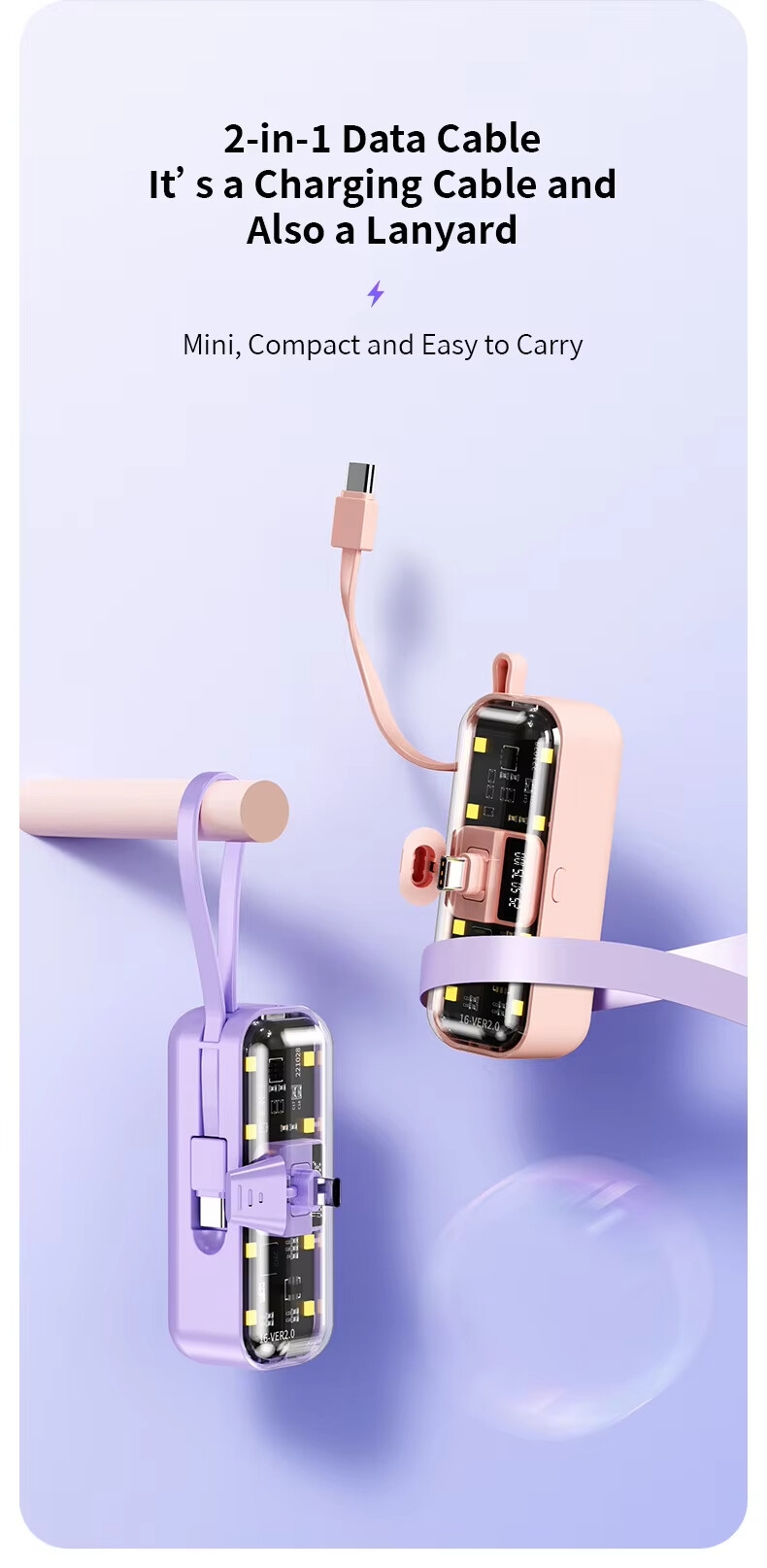 High Capacity: 5000mAh power bank ensures long-lasting charge for your devices.