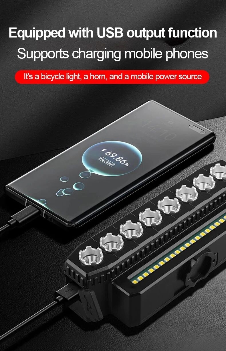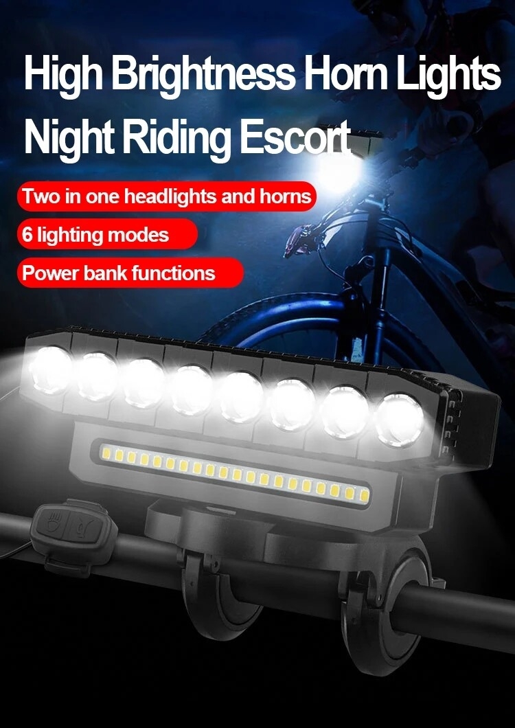 Key Features✨ HighlightsImproved driving safety: All-in-one design with lighting and warning, ride with confidence at night120 dB horn: Long-distance warning for pedestrians and vehicles, every journey is protectedFive powerful horizontal lamps: Penetrating lighting, wider and clearer field of visionFast charging + long battery life: No more battery worries during daily commutes