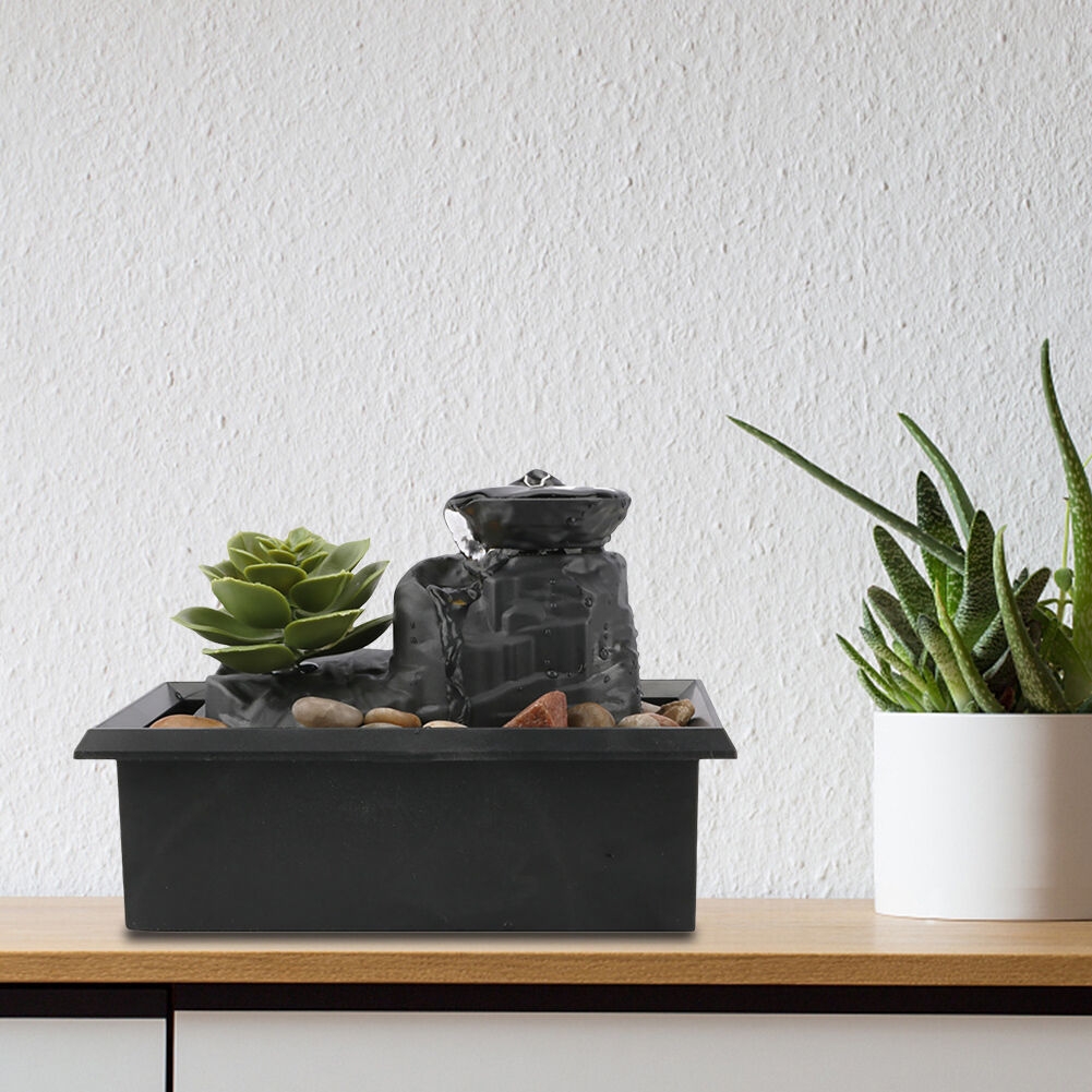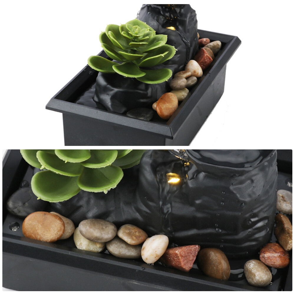 LED Running Water Fountain Ornaments, Artificial Potted Flowers Flowing Water Ornaments Decorations, Desktop Waterfall Fountain with Pebbles – USB/Battery Powered Description: The combination of a running water fountain, artificial plants, pebbles, and LED lights enhances our decor. Stylish and elegant, simply fill the running water fountain with fresh water after installing it within the potted plant. Once powered on, this fountain will bring a soothing and beautiful ambiance to your home and yard. Let the soothing water cascade from the tiered bowl, making this fountain a focal point in any room, whether it's your bedroom, living room, home, or office. This office desktop fountain is adorned with smooth, polished pebbles, gently washed by flowing water, creating a soothing, natural aesthetic. The fountain's circulating water symbolizes continued prosperity and abundance, bringing positive energy and creating a tranquil atmosphere. This unique decorative indoor electric fountain will surely add value to any space you wish to impress your guests. It's a stylish home decoration that can be placed on kitchen counters, living room tables, and desks. This isn't just a decorative item; it's also a symbol of good luck and wealth. Features: 1. [Soothing Waterfall Effect] The combination of a flowing water fountain, simulated plants, pebbles, and LED lights enhances the beauty of our decor. Stylish and elegant, after installing the flowing water fountain within the bonsai, simply fill it with clean water. Once plugged in, this fountain will bring a soothing and wonderful ambiance to your home and yard. 2. [Versatile Decoration] Add a touch of sophistication to your interior decor. The mini fountain's sleek, modern design blends seamlessly with various decor styles, making it an eye-catching and versatile addition to any space. 3. [USB/Battery Powered] You can flexibly power the tabletop fountain via USB or two AA batteries (not included). Easily connect it to a computer or laptop, or use the batteries for a wireless experience. 4. [Compact and Portable] Measuring 4.3 x 3.5 x 6.7 inches, the indoor fountain is perfect for a desktop, bookshelf, or small space. The compact design allows you to enjoy the tranquility of a waterfall wherever you go.