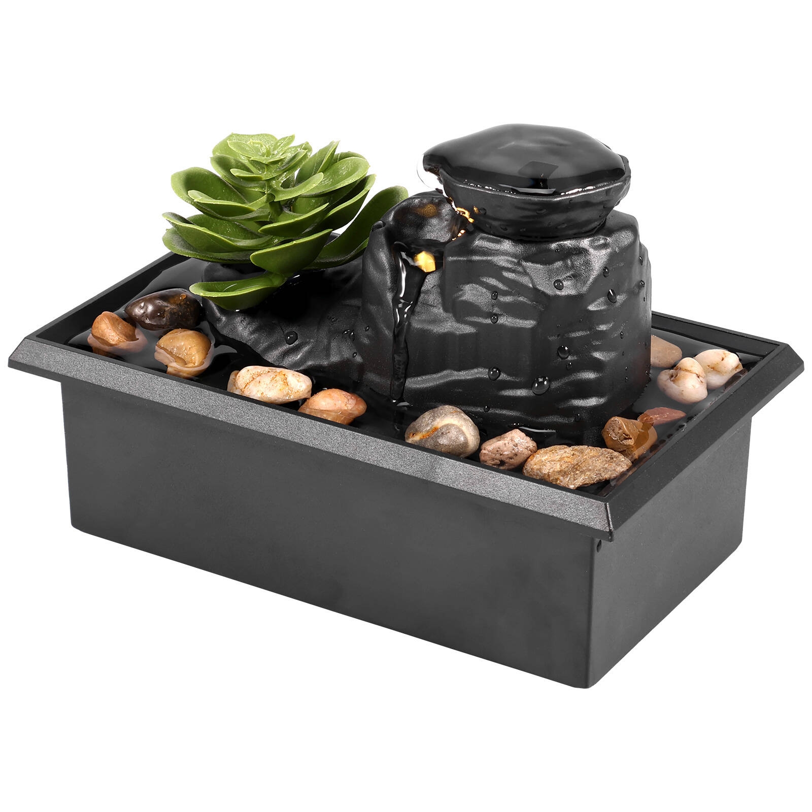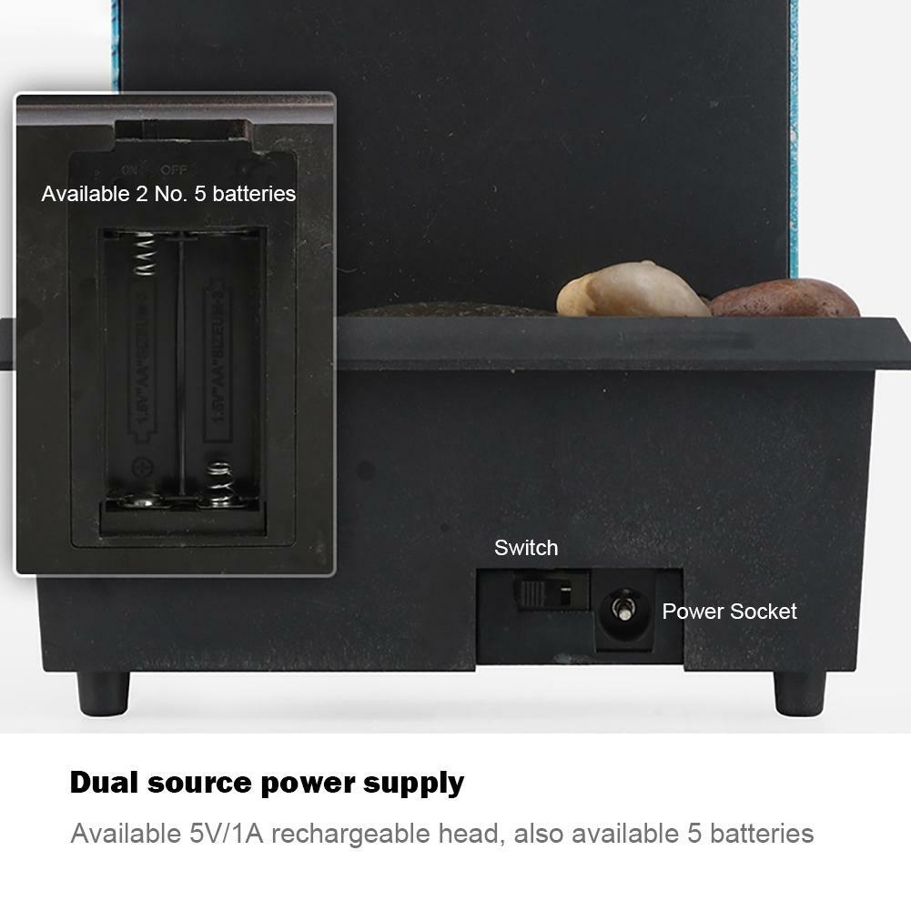 5. [Natural River Stones] The waterfall fountain features natural river stones, enhancing the visual appeal of this tabletop fountain. These rocks add a sense of authenticity to the design and contribute to the overall aesthetic. This tabletop fountain can help you de-stress and relax after a busy day. Turn on this fountain before bed to listen to the gurgling sound of the flowing stream to help you fall asleep. Use it while you're meditating or doing yoga. You can even place it on your cubicle desk to help you focus while working. Specifications: Item Type: Waterfall Fountain Material: Plastic Dimensions: Approximately 15 x 11 x 9 cm / 6.06 x 4.45 x 3.46 inches Lighting: LED yellow light Power supply: USB or AA batteries x 2 (not included) Use: Living room, bedroom, study, office, coffee table decoration, TV cabinet decoration Weight: 0.4 kg Instructions: Add the appropriate amount of water and turn on the power switch to start using. Package Includes: LED Running Water Fountain Ornaments *1 Stone Accessory Bag *1 USB Data Cable *1