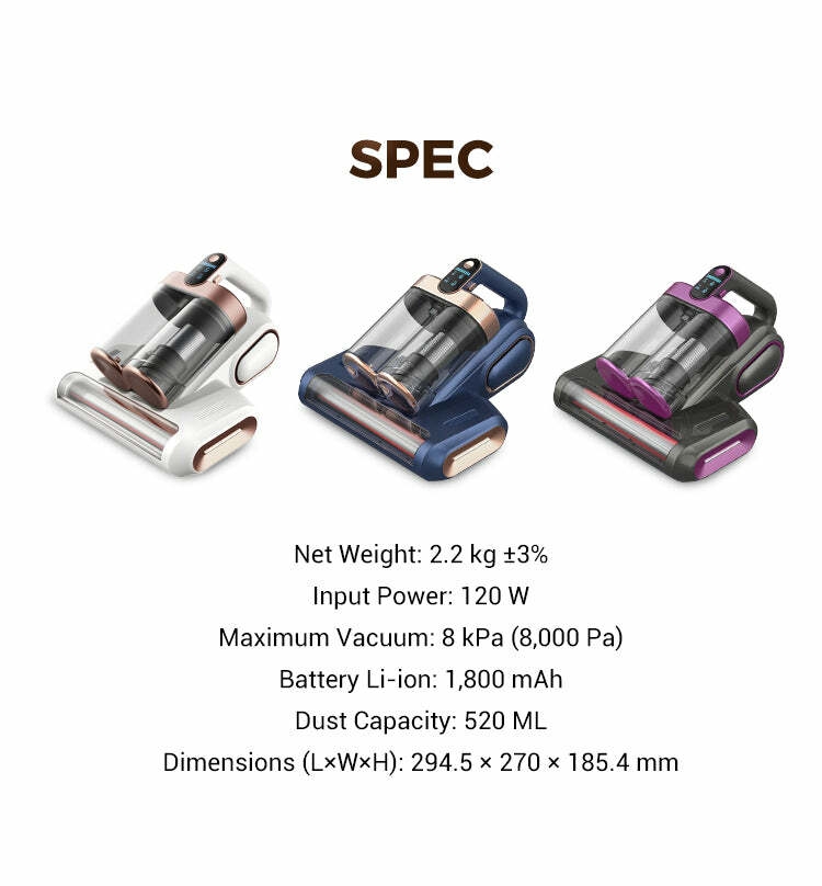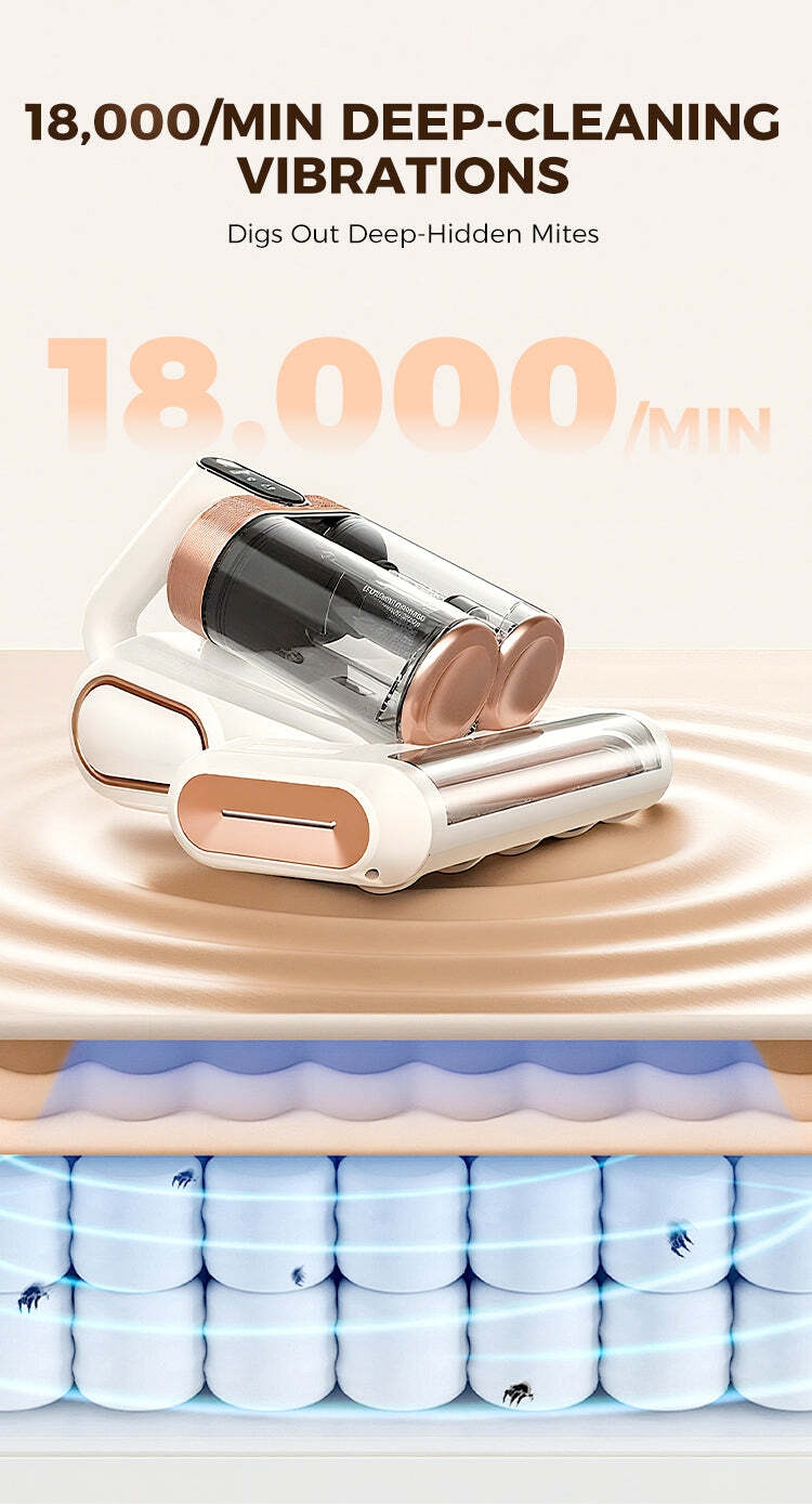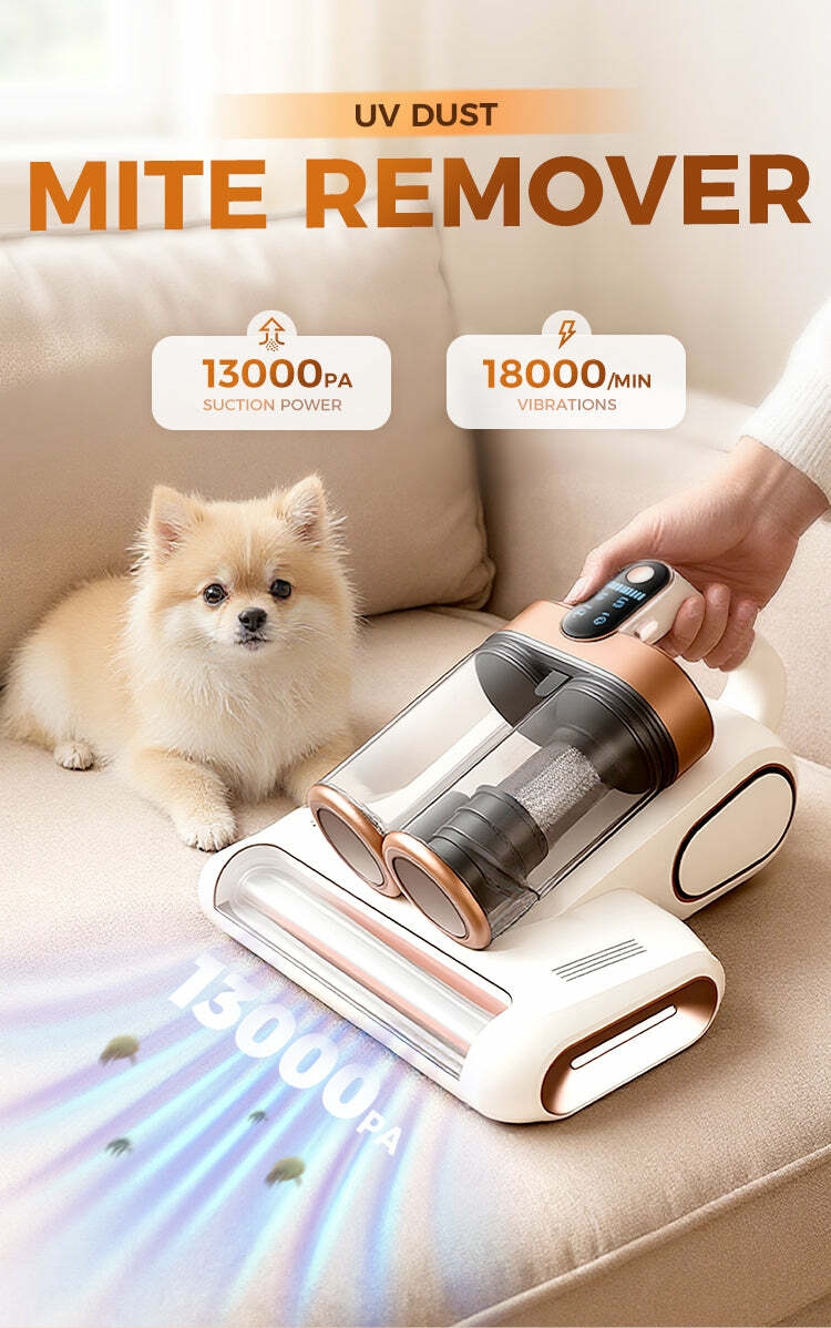 Key FeaturesHigh-suction power effectively removes dust mites, allergens, and fine debris.UV-C sterilization kills bacteria and mites for a deeper, healthier clean.HEPA filtration system traps microscopic particles and prevents secondary pollution.Vibrating beat function loosens embedded dirt from mattresses and fabrics.Lightweight ergonomic design makes cleaning beds, sofas, and pillows effortless.Easy-to-clean dust bin allows quick maintenance and long-lasting performance.