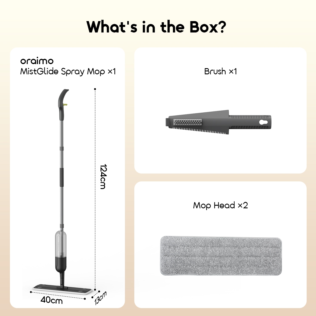 Package Contents: Spray Mop ×1 / Microfiber Mop Pads ×2 / Reusable Bottle ×1 / Scrubber ×1