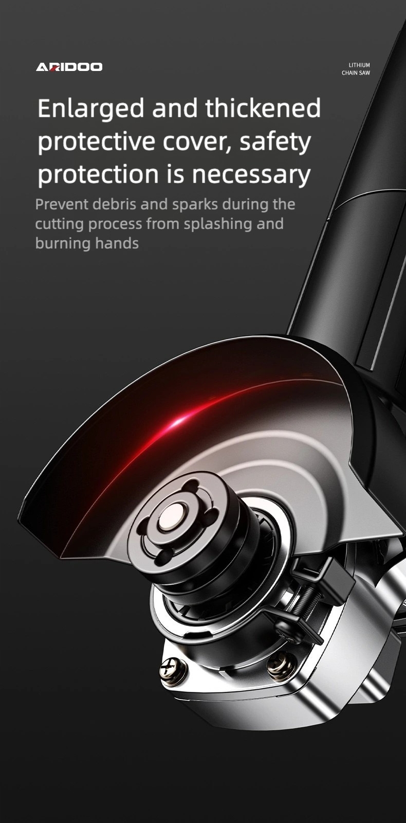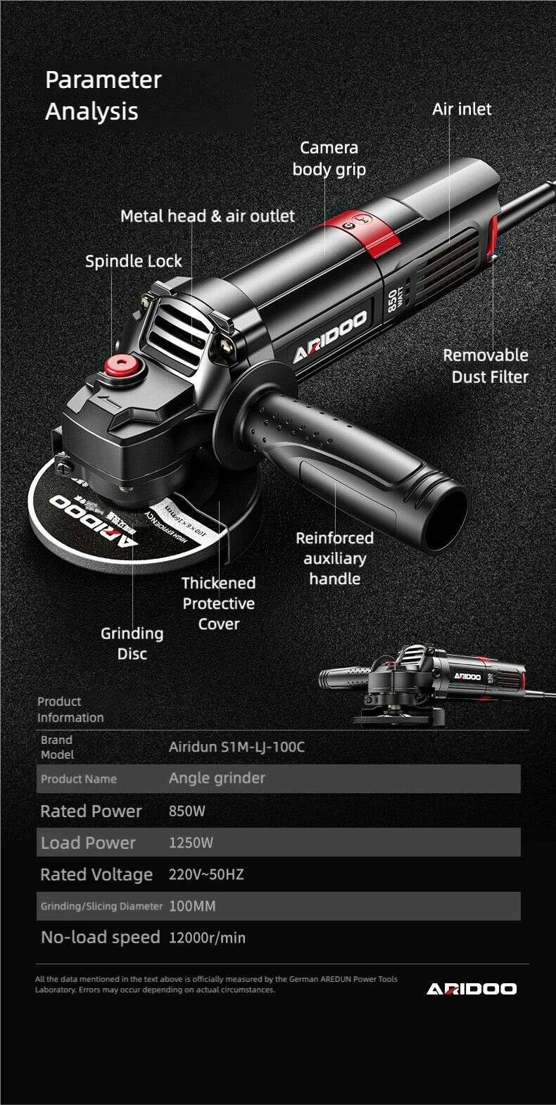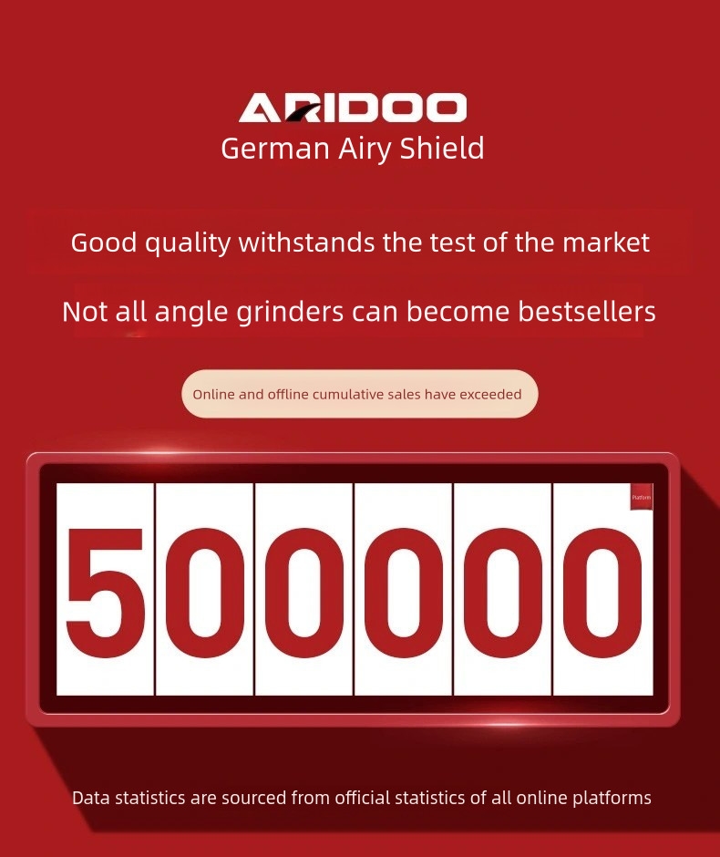 This ARIDOO high-efficiency angle grinder is designed for versatile metal and woodworking tasks, including cutting, grinding, and polishing.