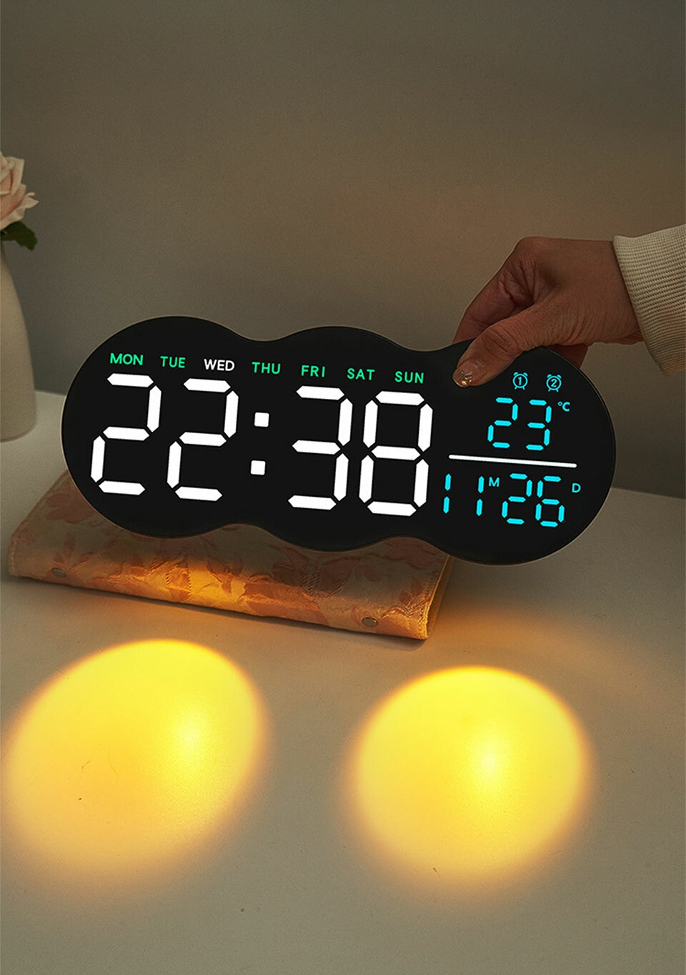 Discover this LED digital wall clock, a versatile clock that integrates a large, easy-to-read display, dual alarms, a digital calendar, and temperature monitoring for efficient time management.