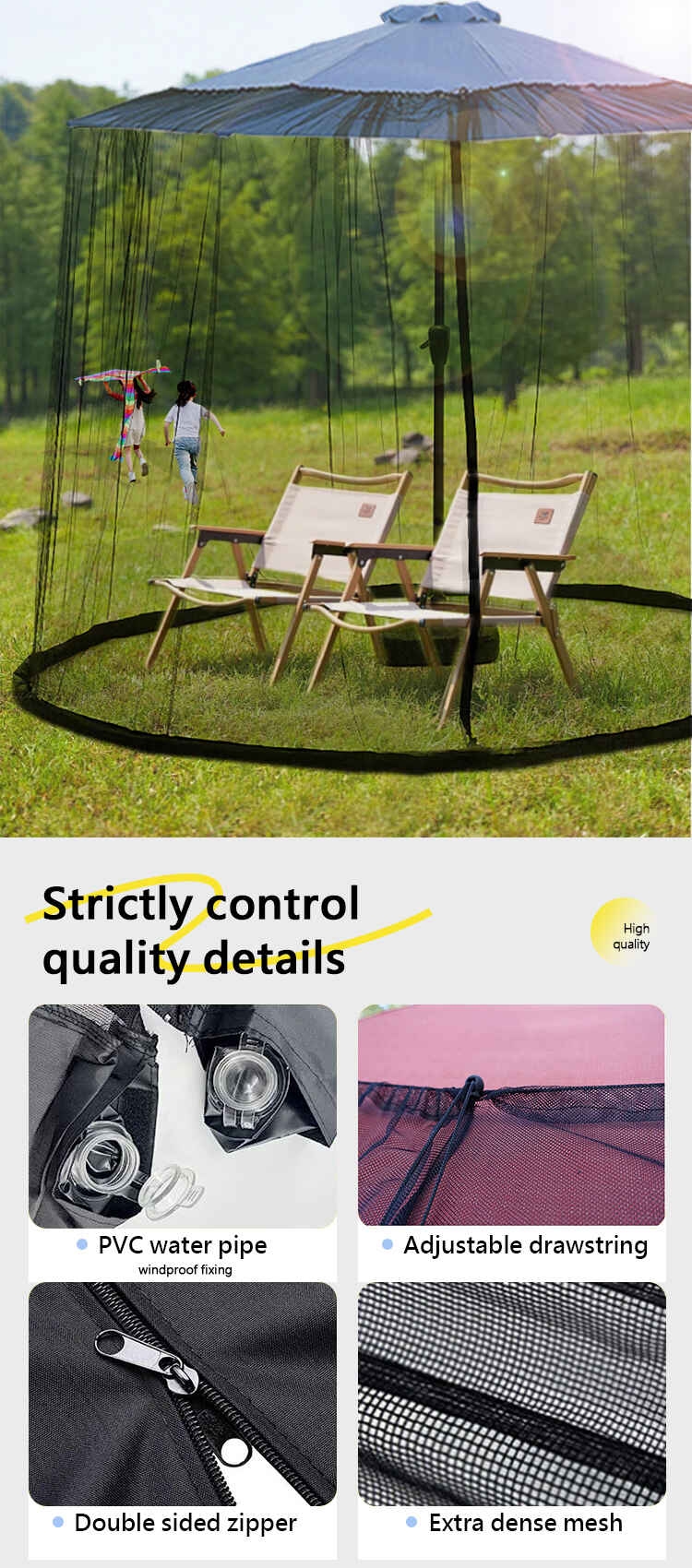 Perfect for outdoor dining, lounging, or hosting gatherings, this mosquito net enhances comfort and peace of mind, letting you savor warm evenings and serene moments without the nuisance of bites. Elevate your outdoor living experience—stay protected, stay relaxed.