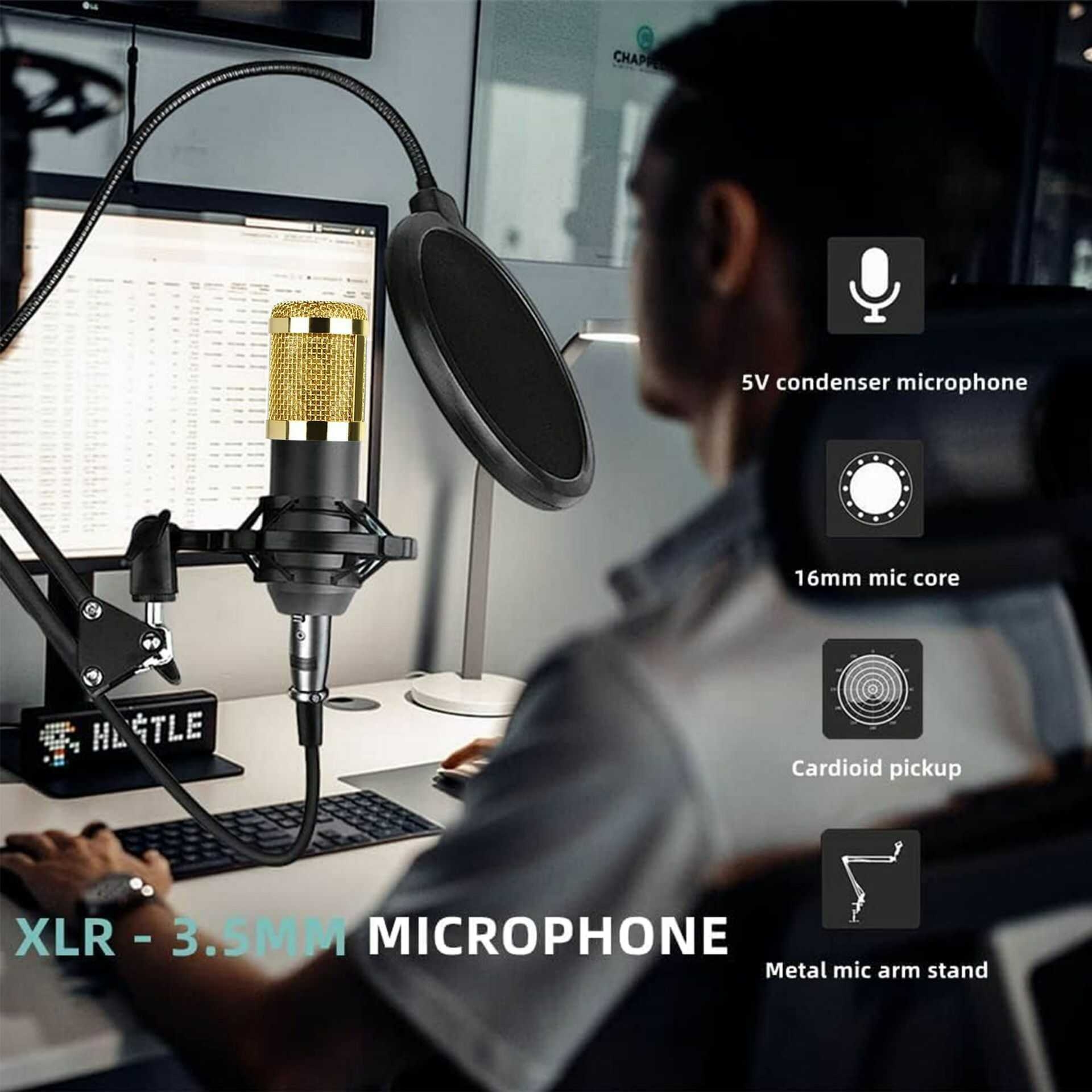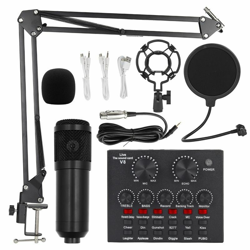 Professional Podcast Equipment Bundle - The Podcast Equipment Bundle is Equiped with a BM-800 condenser microphone, Double-Layer Pop Filter, an adjustable suspension scissor arm stand, Shock mount, Anti-wind foam Cap, earphone, Power cable, Live sound card.