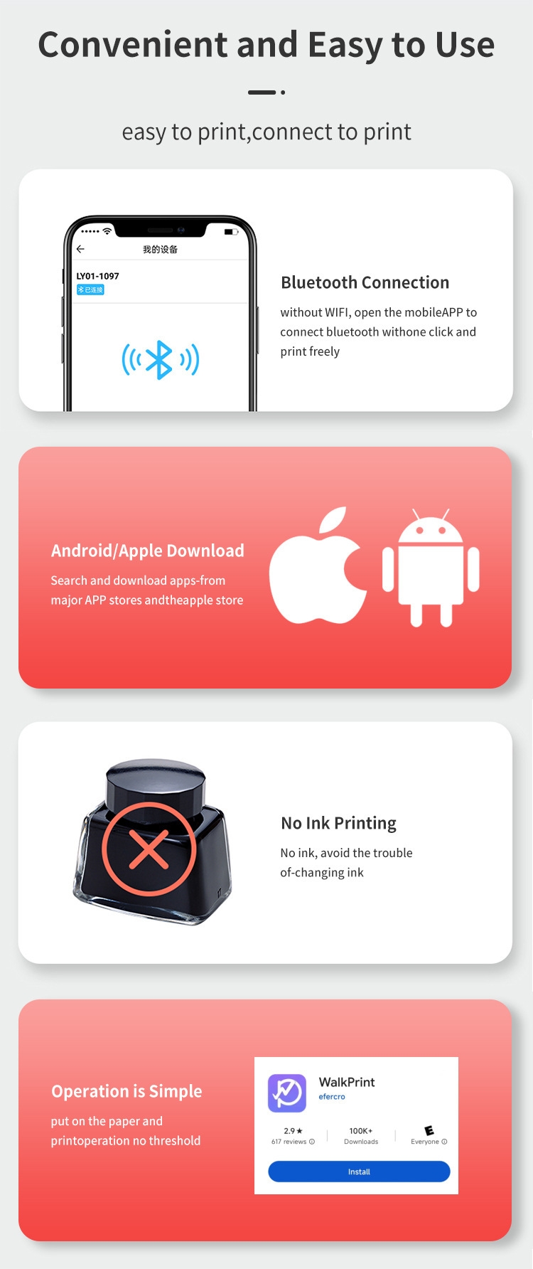 Connection method: Bluetooth connection, thermal inkless black and white printing