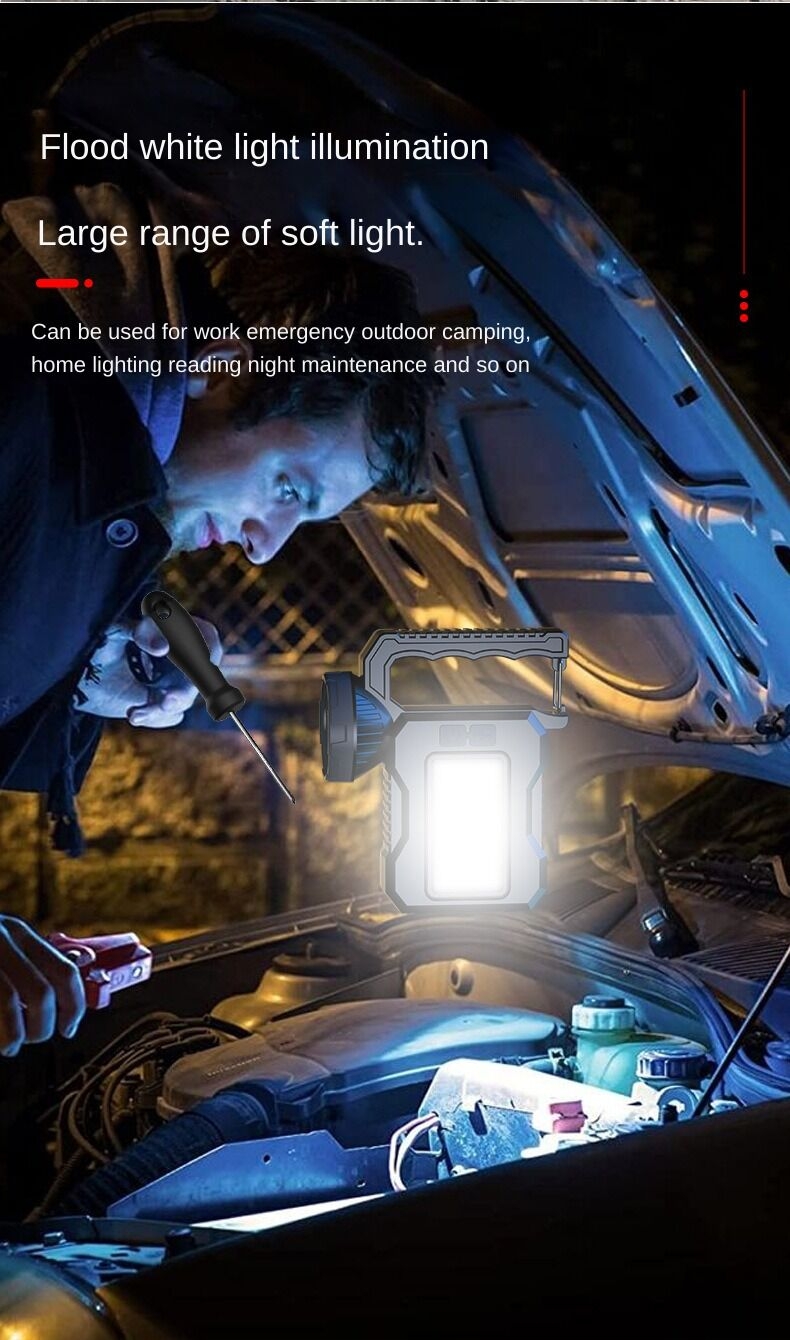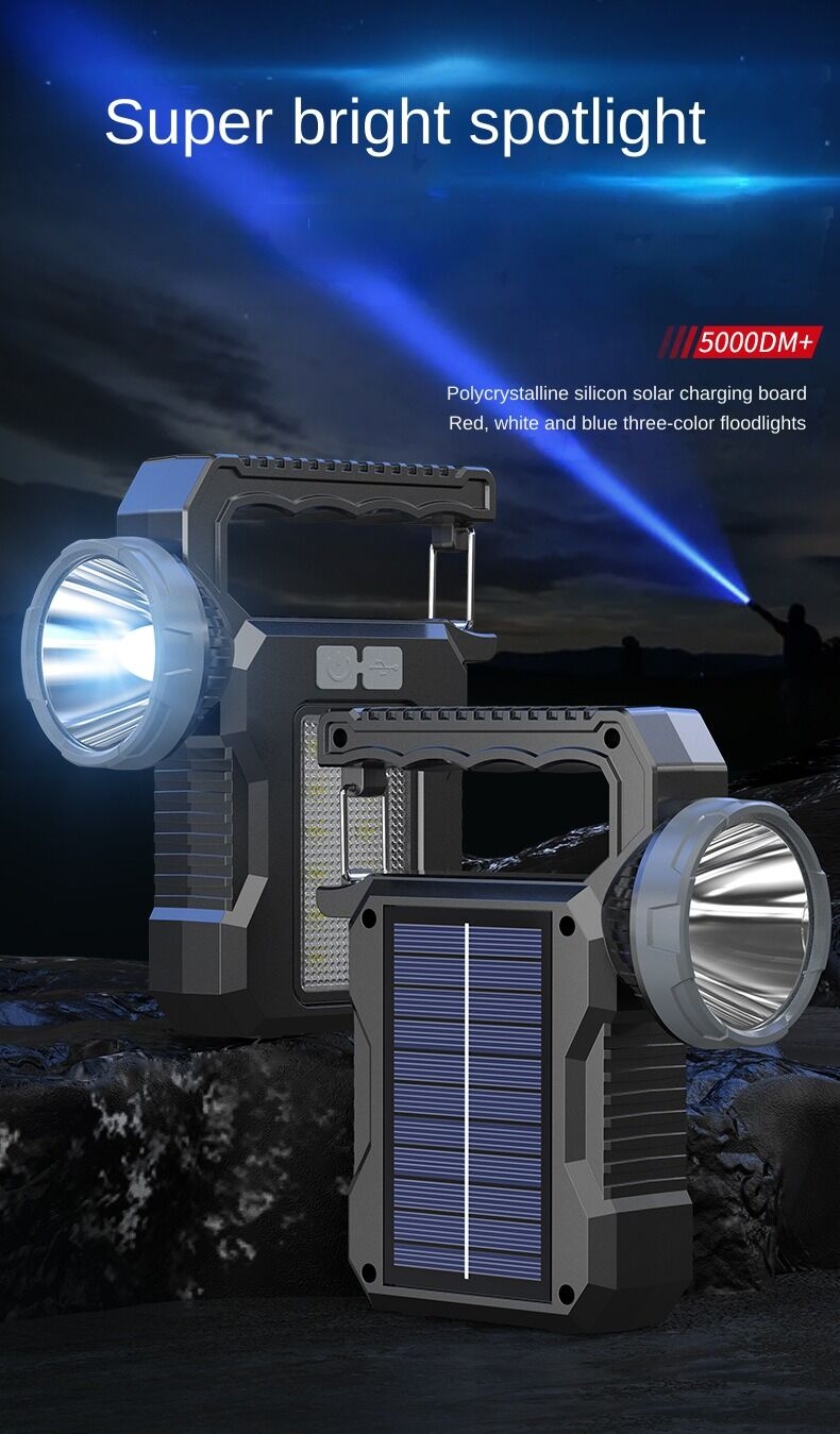 Portable solar flashlight, net weight 150g, battery capacity 1200mah, bulb power 20W, dimensions 13.5X8X3.5cm, material ABS, can be charged by USB and solar power, 3 hours per charge, can be used for 5 to 6 hours It can meet your various needs such as home use, travel, work maintenance and outdoor camping, and is your best choice.