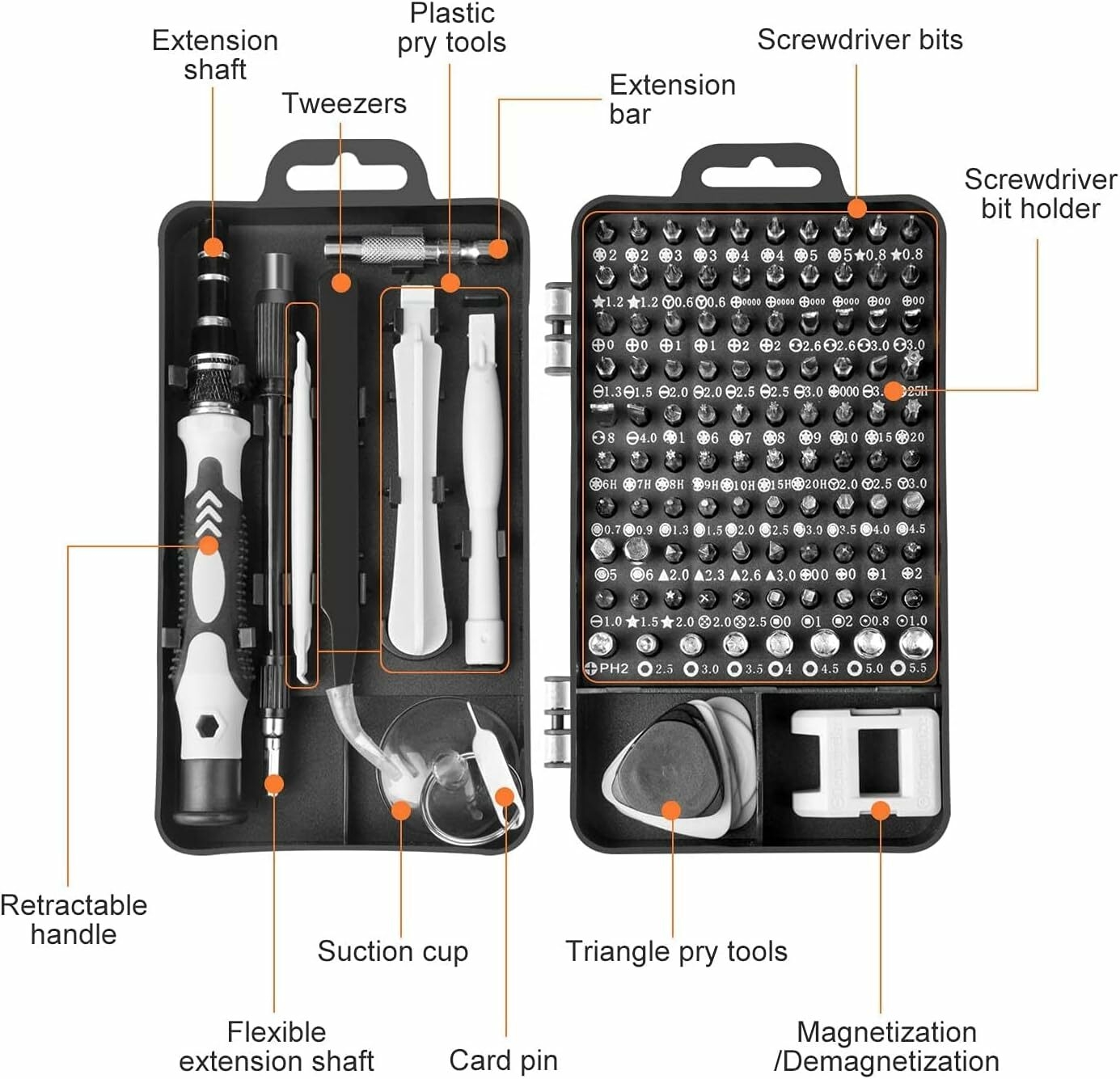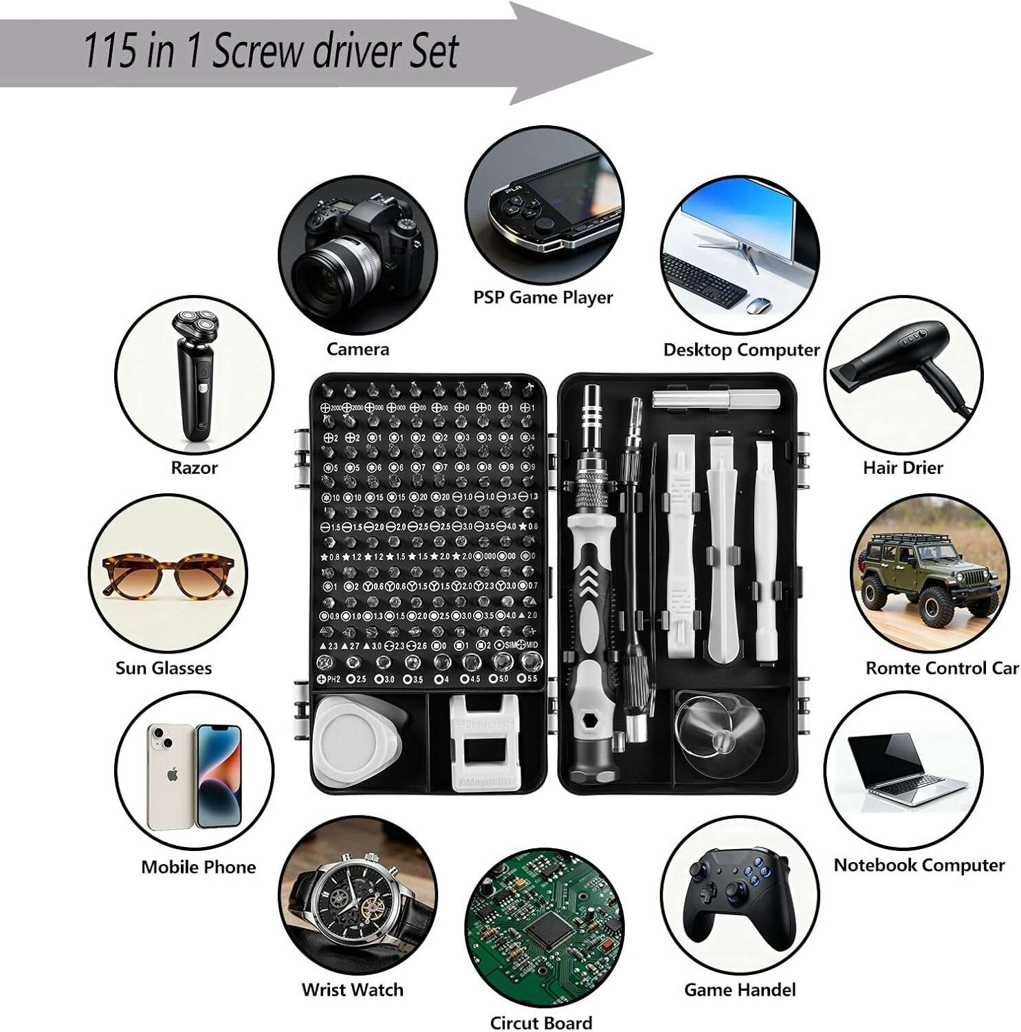 Multi-Magnetic Screwdriver Set :115 in 1 Precision Screwdriver Set have more tools, Comes with all the necessary tools for a wide variety of jobs. Perfect for repairing laptops, mobile devices and other precision items like wristwatches and eyeglasses. Light weight and compact design