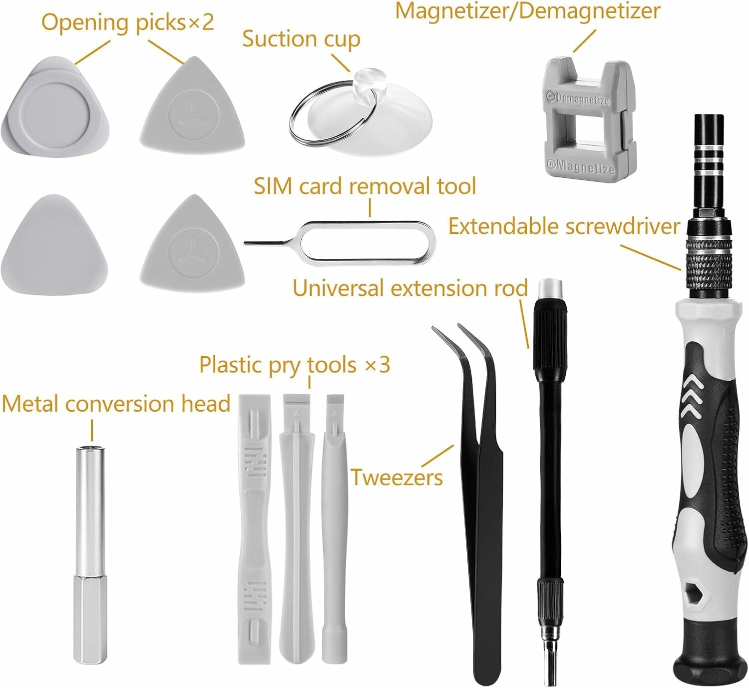 Magnetic Screwdriver Set: The screwdriver heads are magnetic, Made of impact-resistant tool steels, solid as chrome vanadium steel, and they can tighten the screws during repair, which improves performance and saves your time and effort.