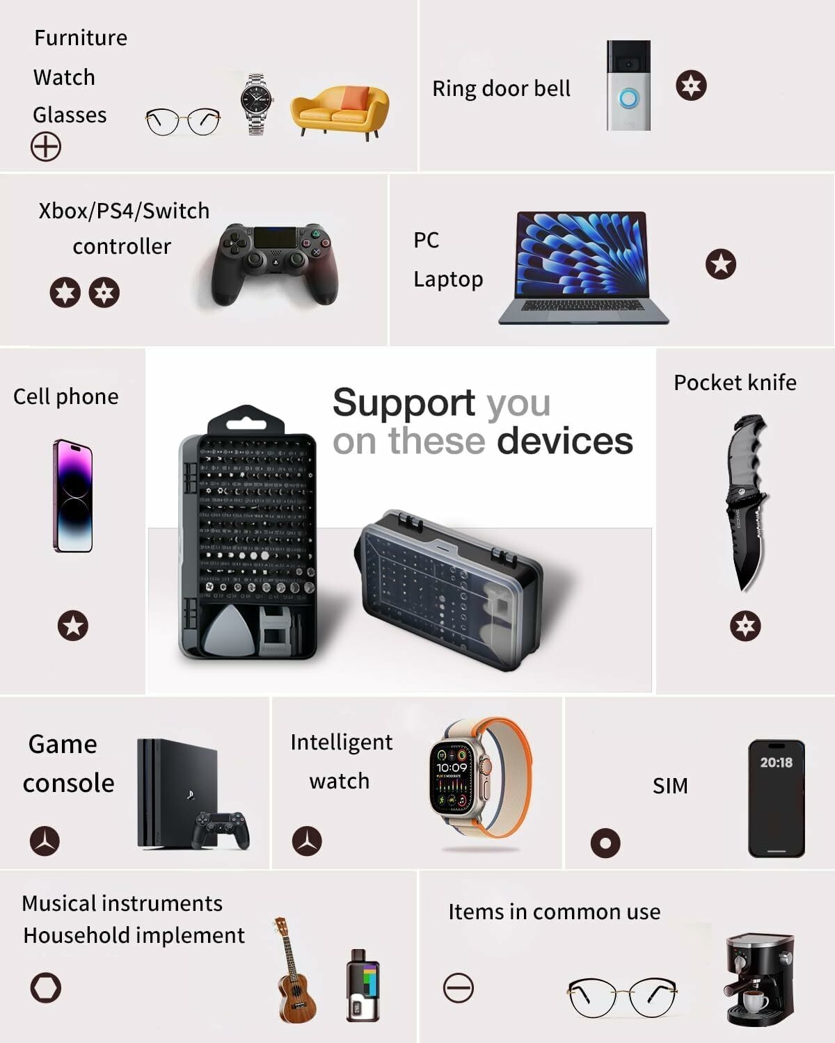 115 in 1 precision mechanics screwdriver set can be used for repairing electronic devices, such as mobile phones, laptops, cameras and household appliances such as TV, air conditioning, refrigerator, car, etc. For disassembly and maintenance of glasses and watches, it is an ideal repair tool set.