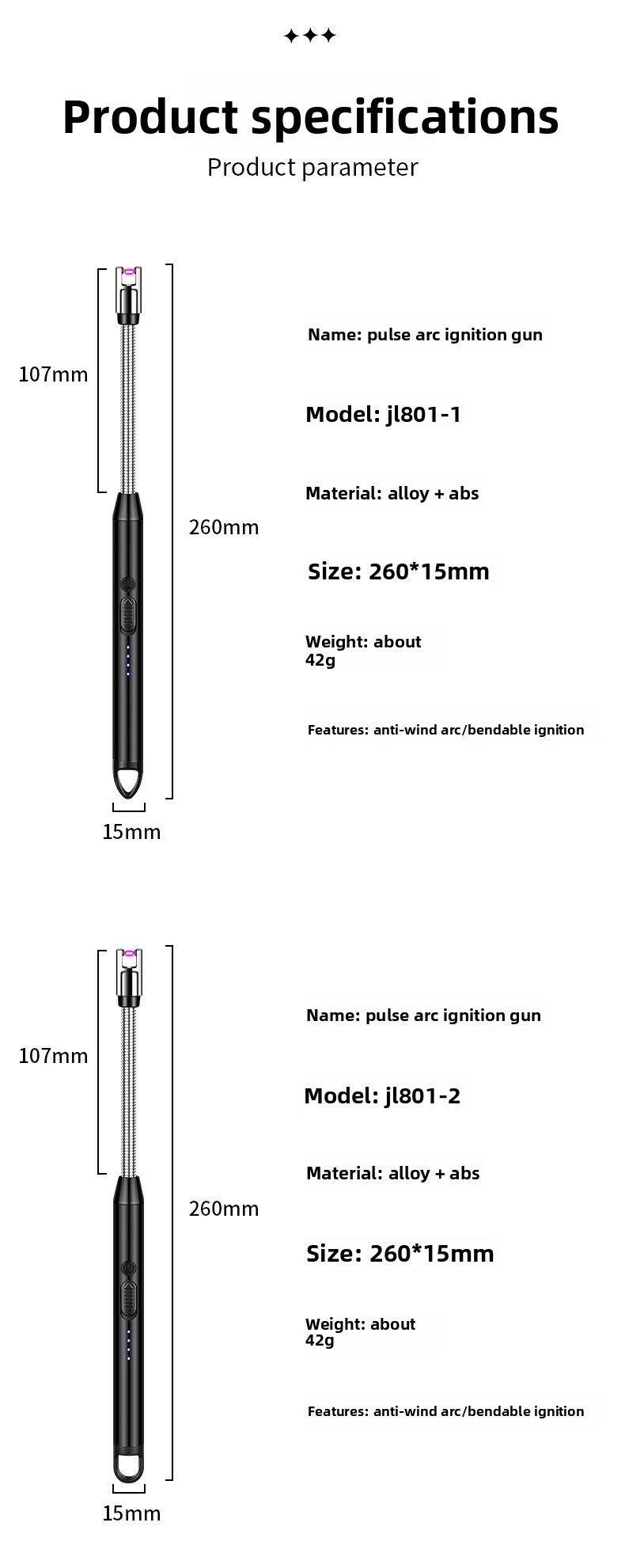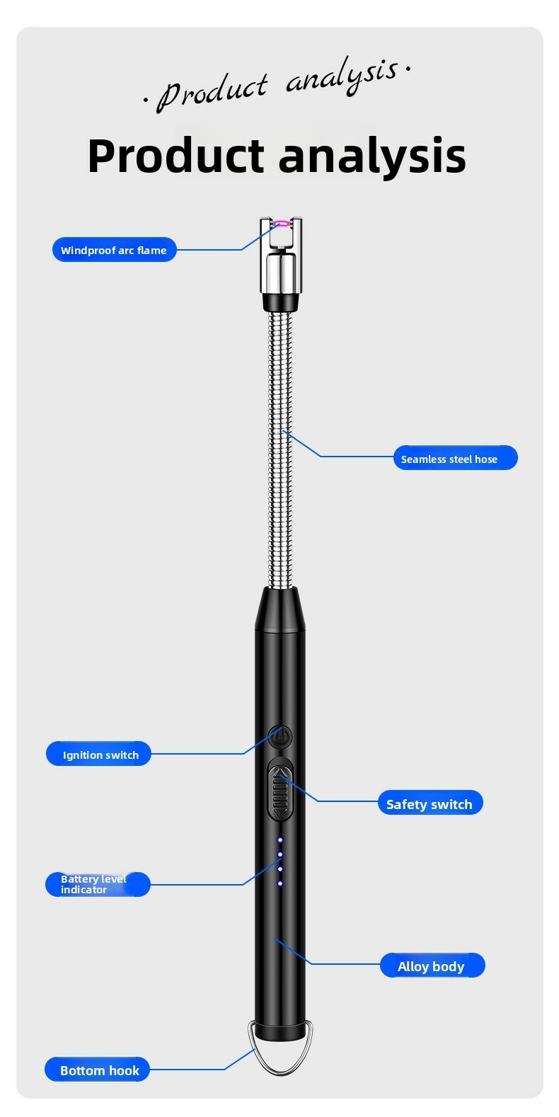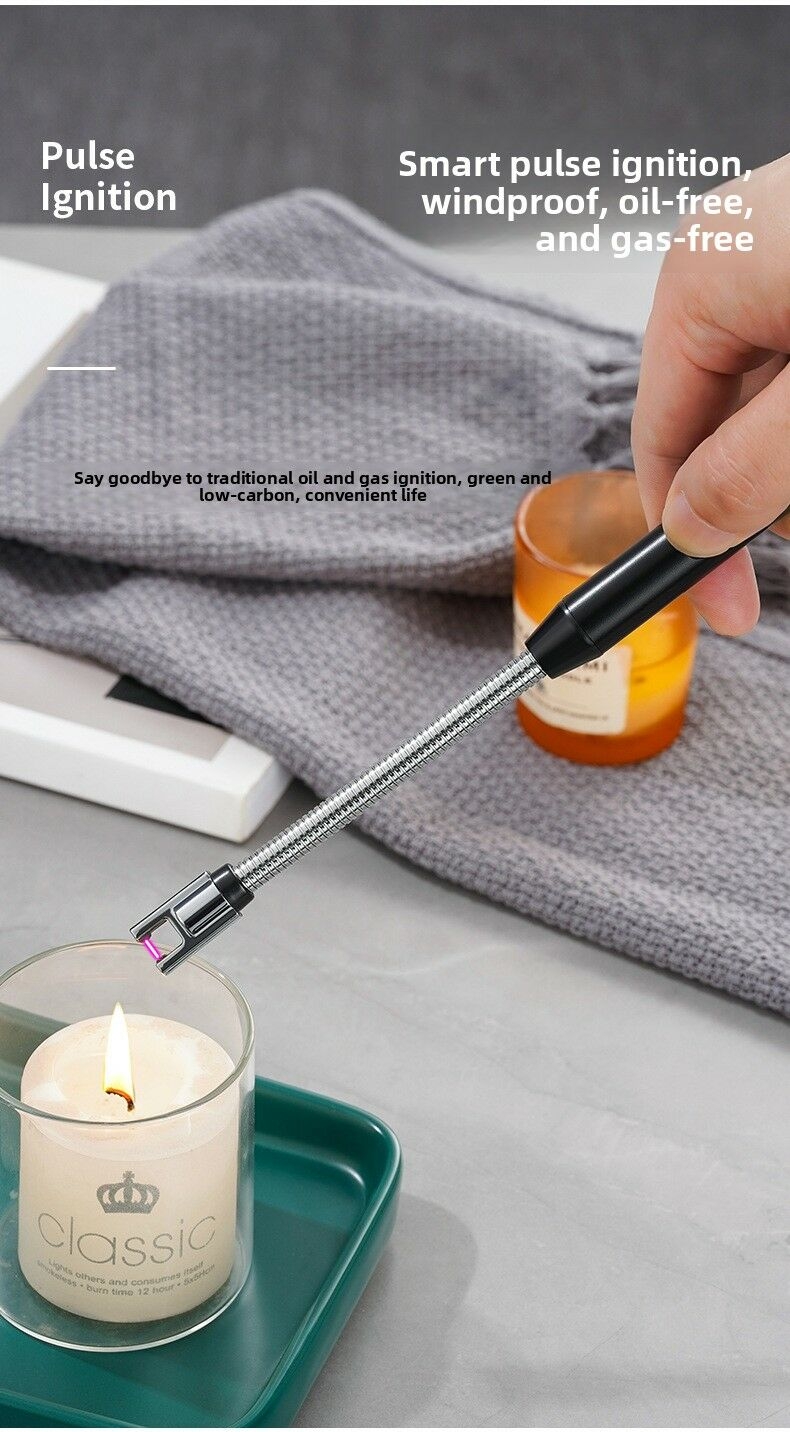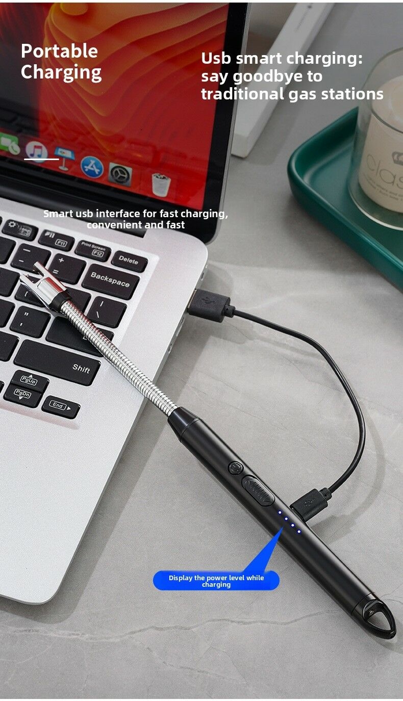 Convenient electronic charging – Easily charge via USB, no need to replace batteries, and can be used for long-term charging.Safe and easy to use – Flameless, windproof, and equipped with a child safety lock.Versatility• Indoor use – Ideal for igniting gas stoves, candles, fireplaces, etc.• Outdoor adventures – Perfect for barbecues, camping, grilling, and emergencies.• Multi-angle lighting – The adjustable neck allows for 360° positioning, making it easy to ignite from any angle.