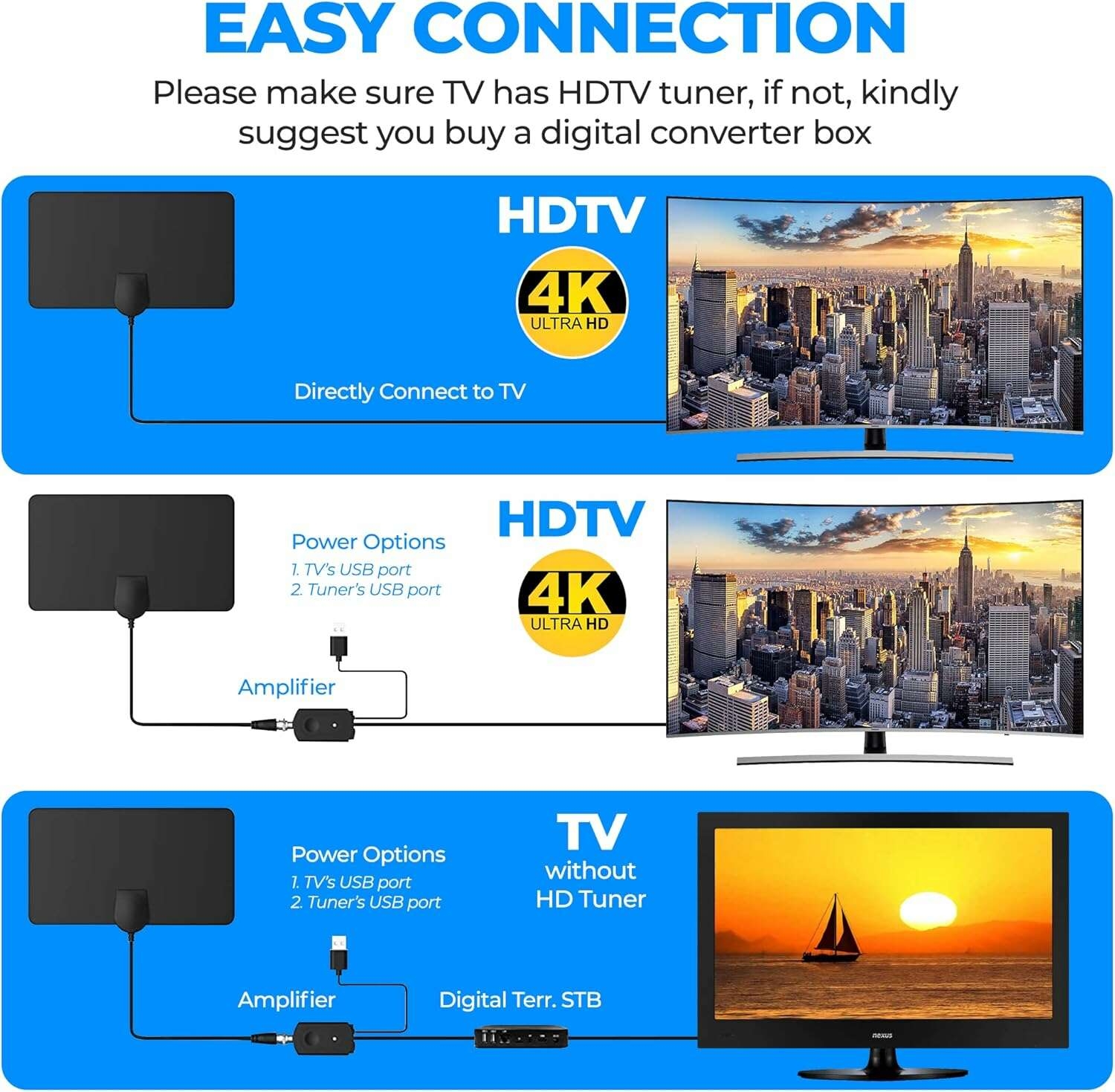 【SIGNAL & 13FT LONG CABLE】The amplified digital tv Antenna indoor comes with 3ft long cable which makes it easier for you to place the tv Antenna in your house to get the best reception, especially for customers whose televisions are not near windows; It's very important to adjust its position and orientation to achieve the best signal reception