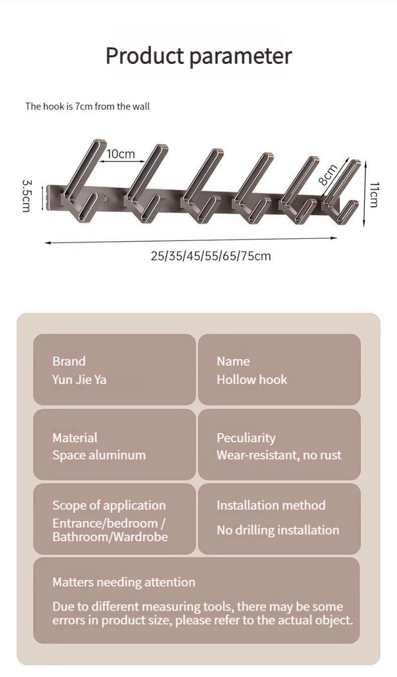 Key FeaturesProduct category: Ordinary hookMaterial: Space aluminumStyle: Single row of 6 hooks (43.5cm)Maximum load: 15kgColor: Gray