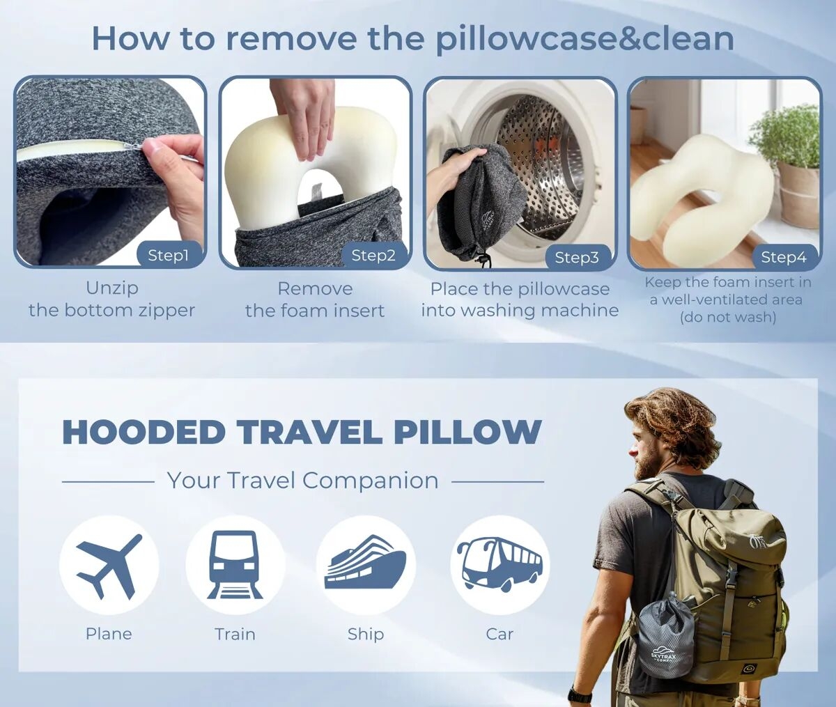 【Adjustable Custom Fit】An adjustable drawstring and anti-slip zipper let you tailor the fit to your preference, ensuring the pillow stays securely in place. Enjoy uninterrupted rest with one of the best travel pillows for long flights, designed to keep you cozy during extended journeys