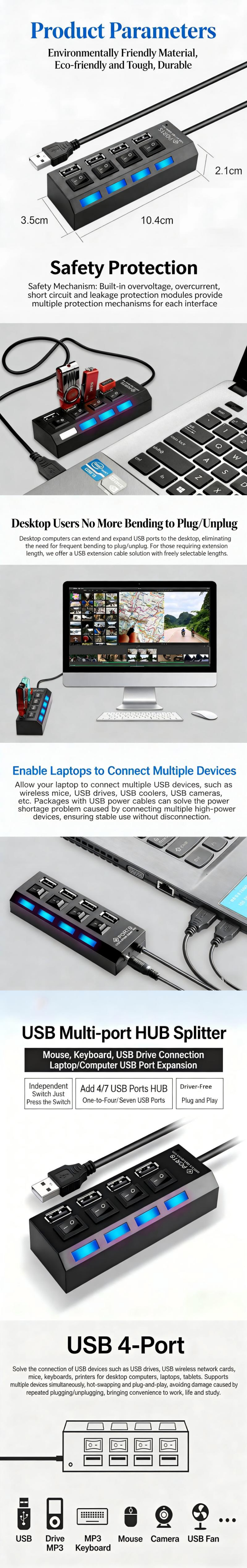 USB 2.0, Four-Port USB Splitter with Multi-Port Extender and Independent Switches-Black