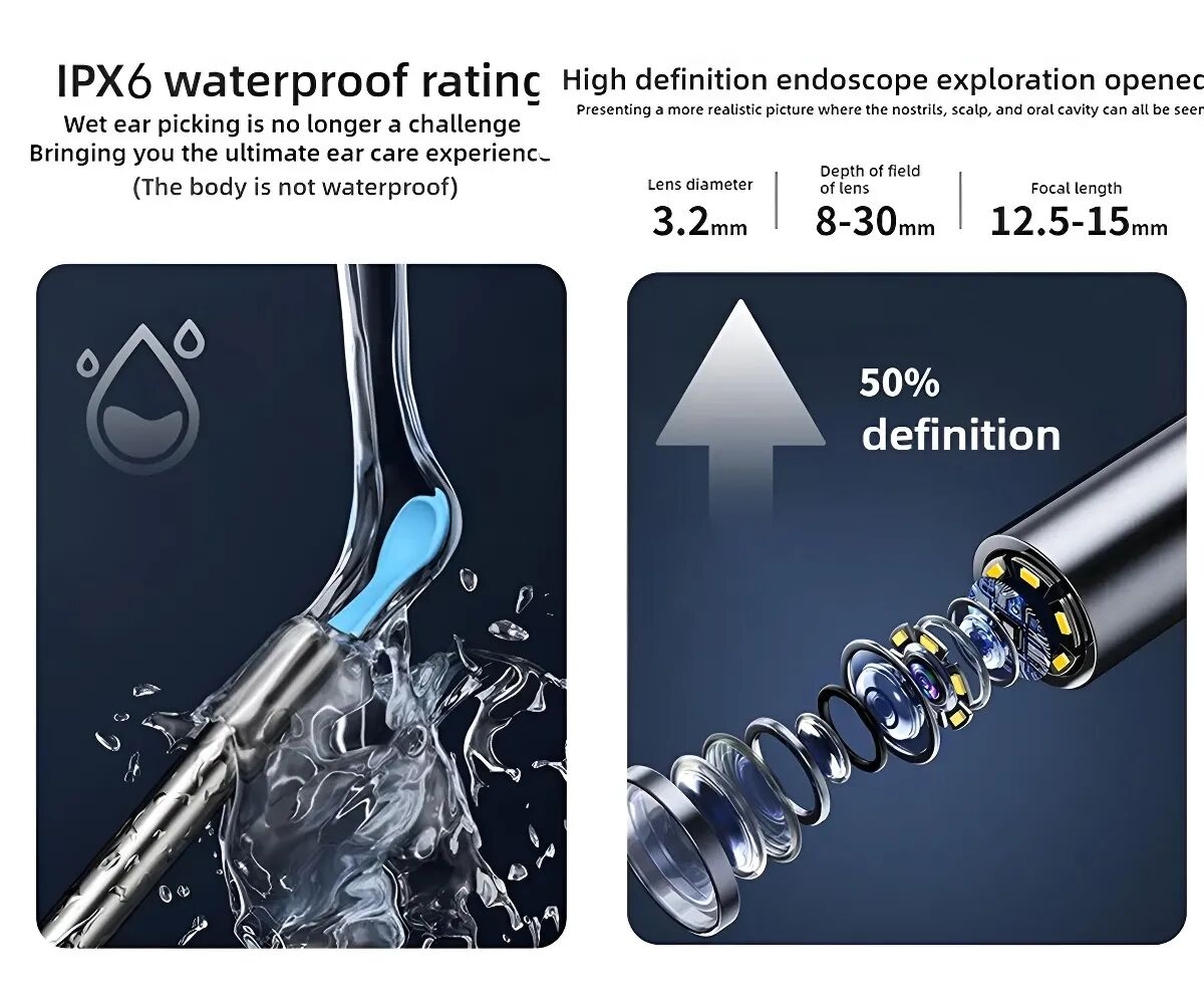 •Equipped with a high-definition camera, it can transmit images inside the ear canal to the mobile phone in real time, helping users to clearly see the internal situation of the ear canal and avoid damage caused by blind cleaning.